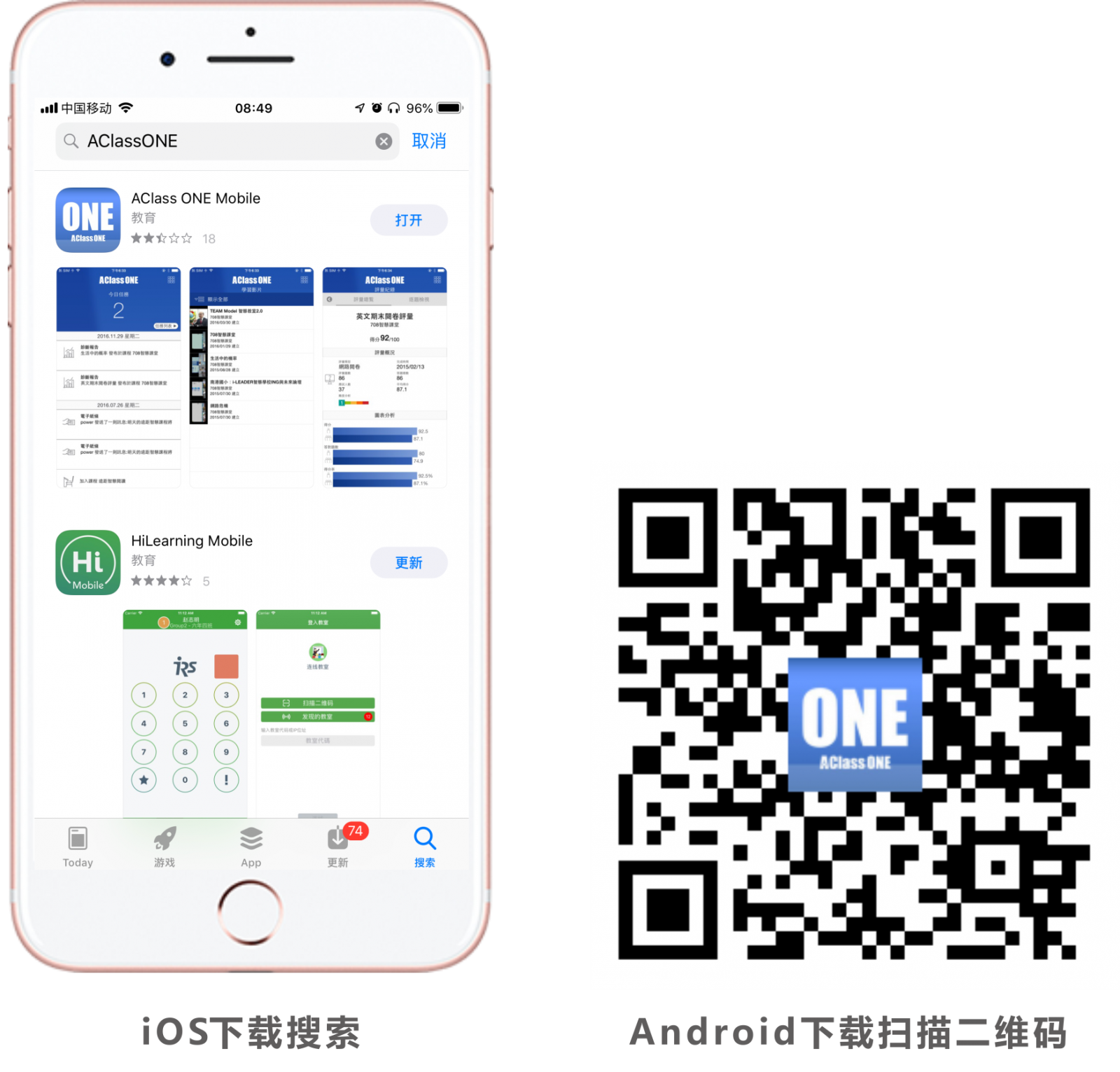 1、使用個人手機,下載App "AClassONE智慧學(xué)伴"。iOS系統(tǒng)直接在AppStore搜索下載,Android系統(tǒng)用微信掃描以下二維碼,在瀏覽器中復(fù)制鏈接進行下載。