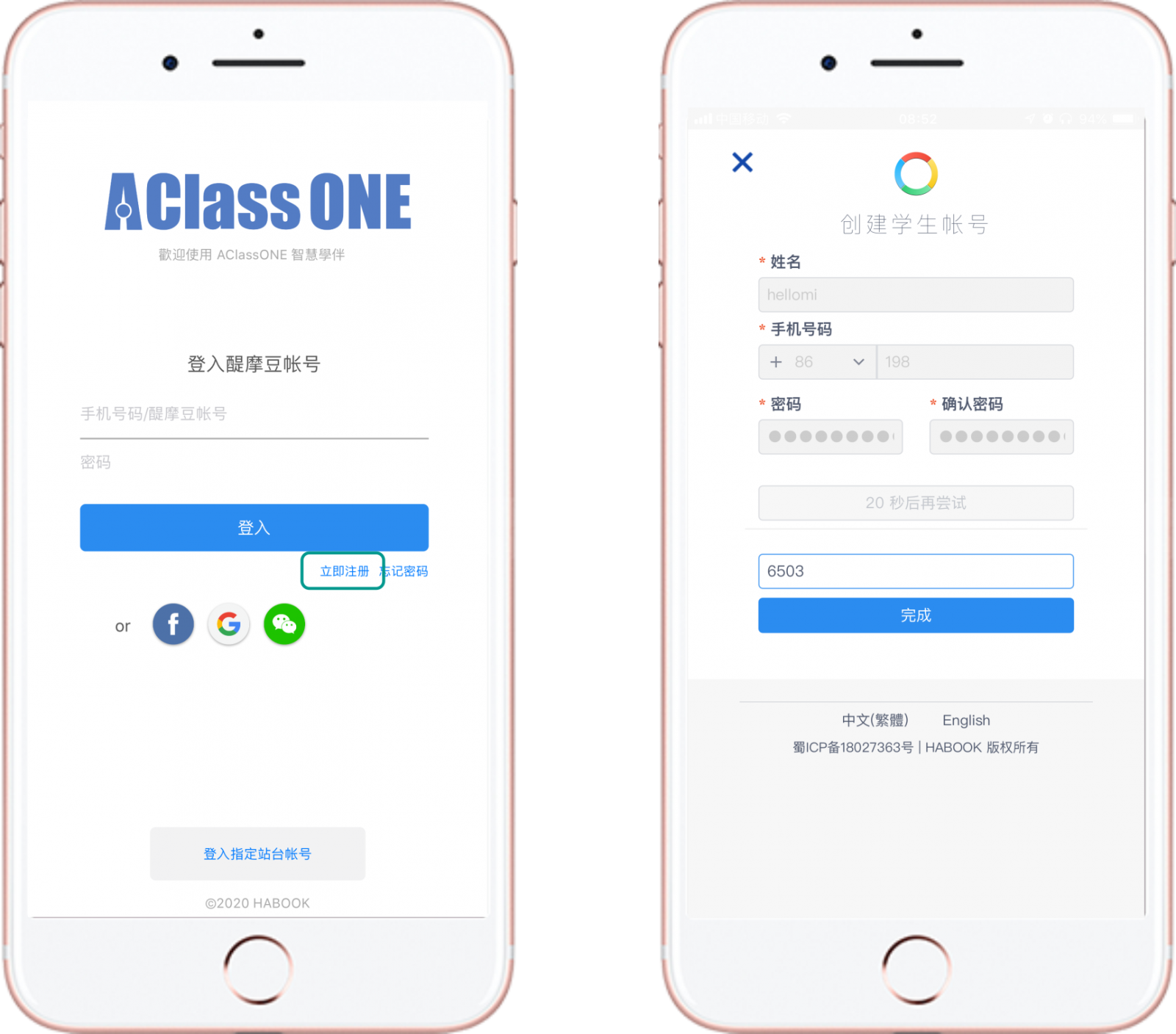 2、點擊AClassONE智慧學(xué)伴App,點擊 立即注冊,輸入姓名、手機號碼、密碼和發(fā)送驗證碼。輸入驗證碼后,點擊完成按鈕。