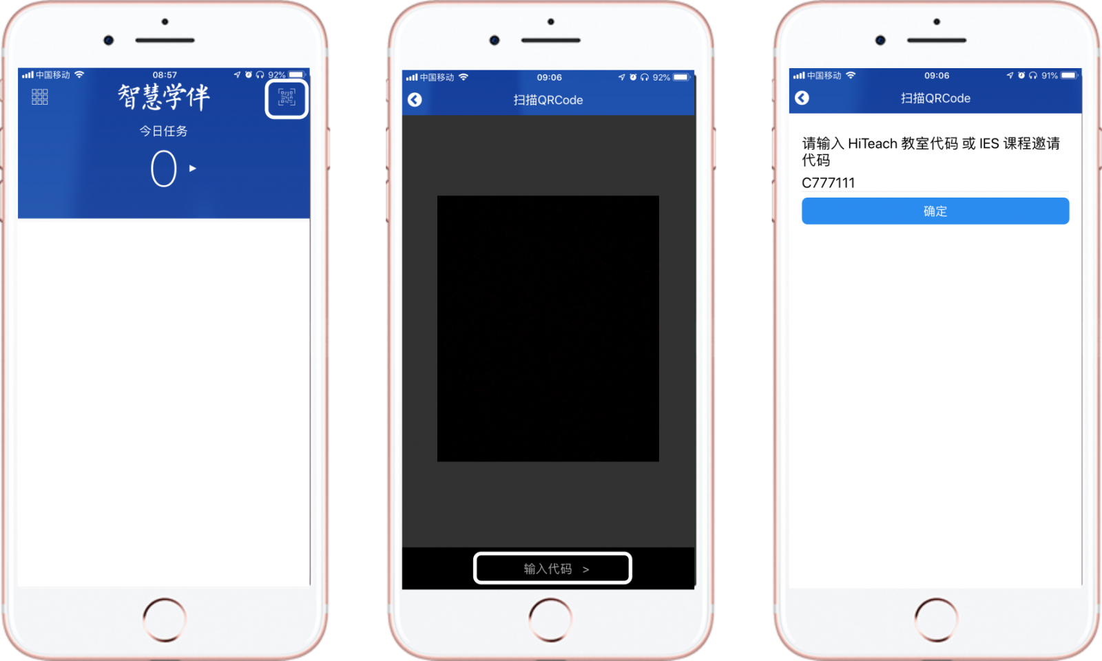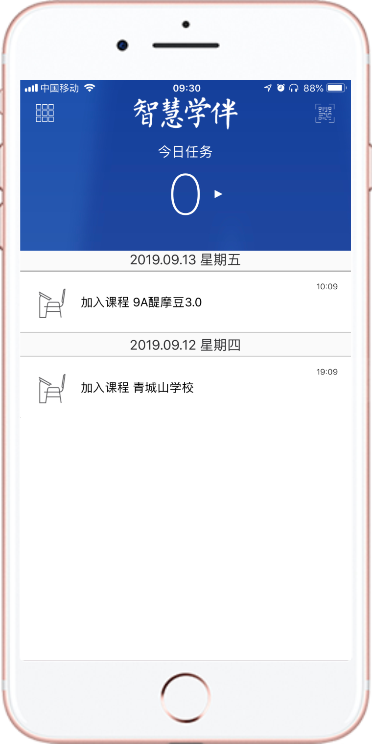 3、進入App主頁后 ,點擊右上角二維碼圖標(biāo),掃描課程二維碼或點擊輸入代碼,輸入課程邀請碼,即可加入課程。(課程邀請碼請老師提供,由“大寫字母C+6位數(shù)字”組成)。