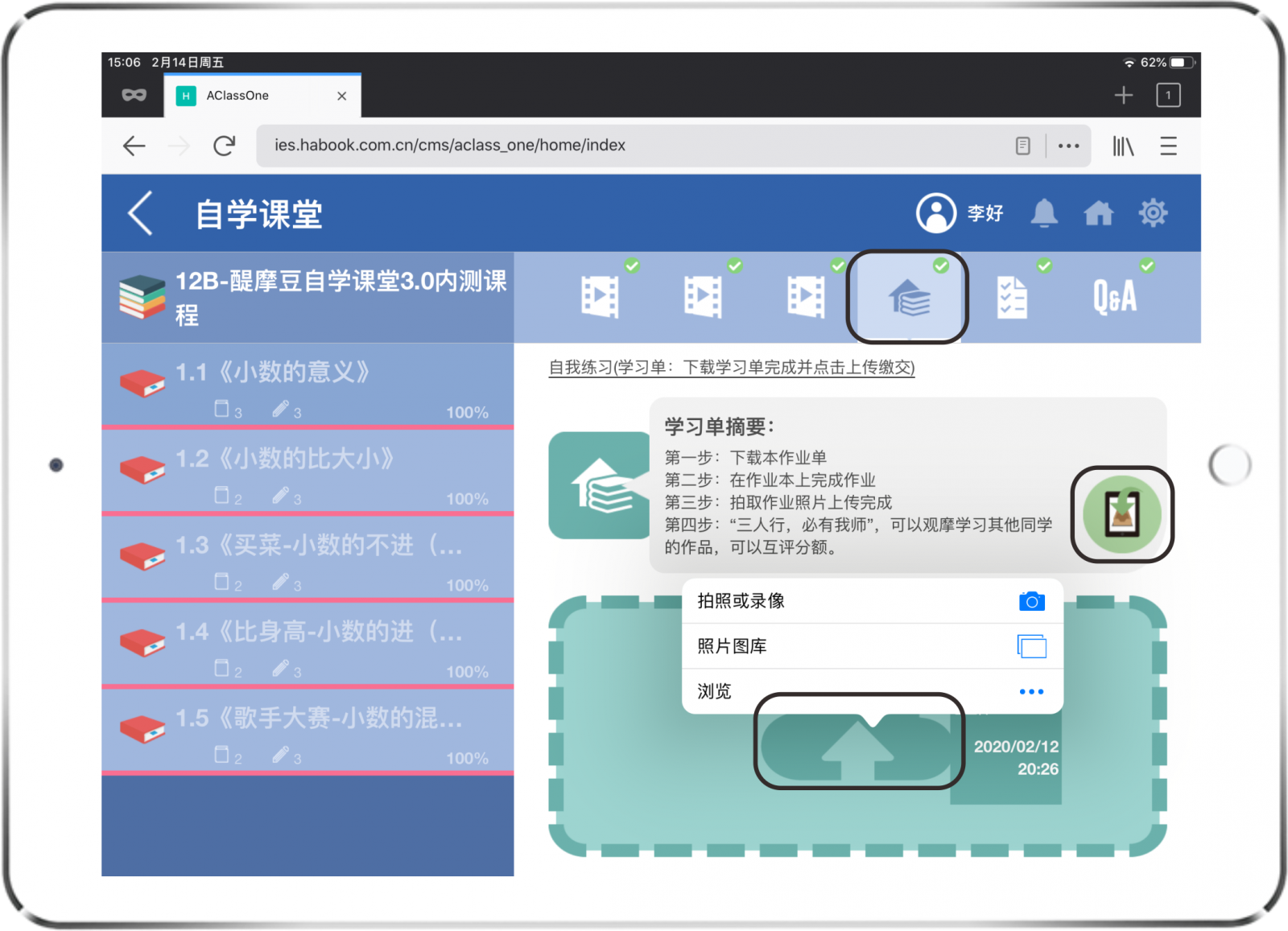 6、學(xué)習(xí)單學(xué)習(xí): 點(diǎn)擊下載按鈕,下載學(xué)習(xí)單后進(jìn)行編輯完成學(xué)習(xí)單后,點(diǎn)擊上傳按鈕,選擇拍照/圖庫,進(jìn)行作業(yè)上傳。