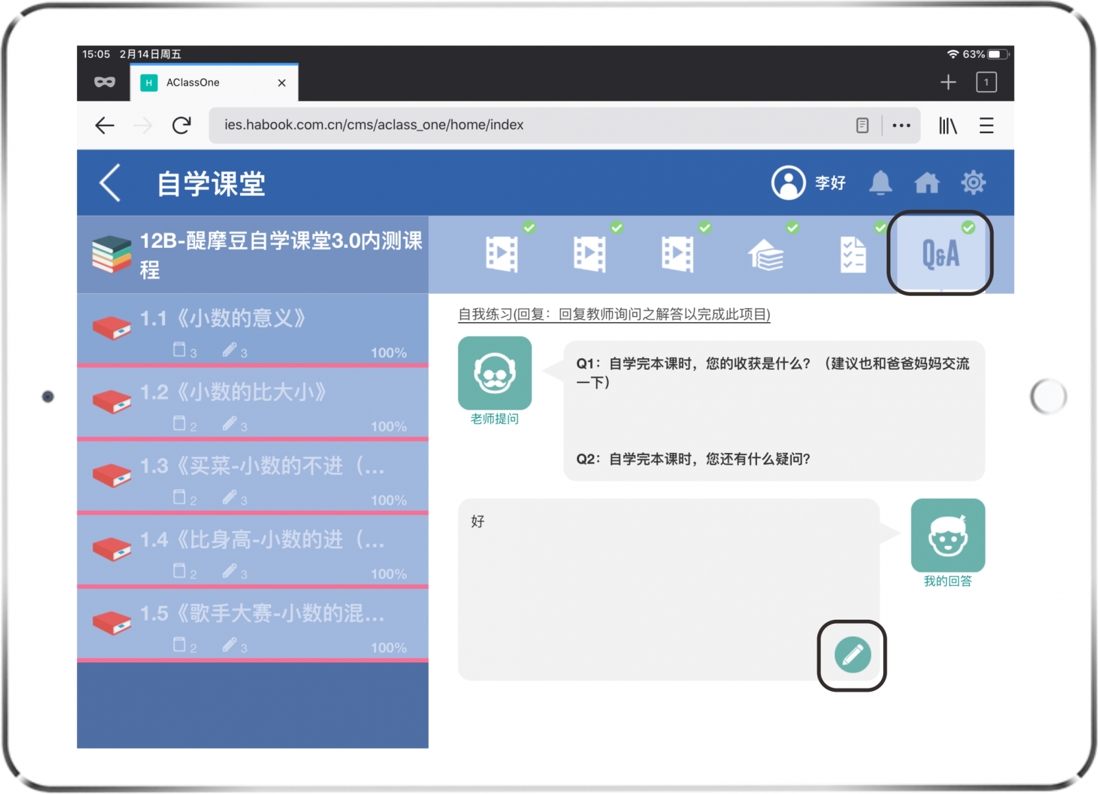 8、師生互動(dòng):點(diǎn)擊編輯按鈕,輸入本章節(jié)的學(xué)習(xí)收獲、疑問求解。這樣就完成了自學(xué)課堂的學(xué)習(xí)。