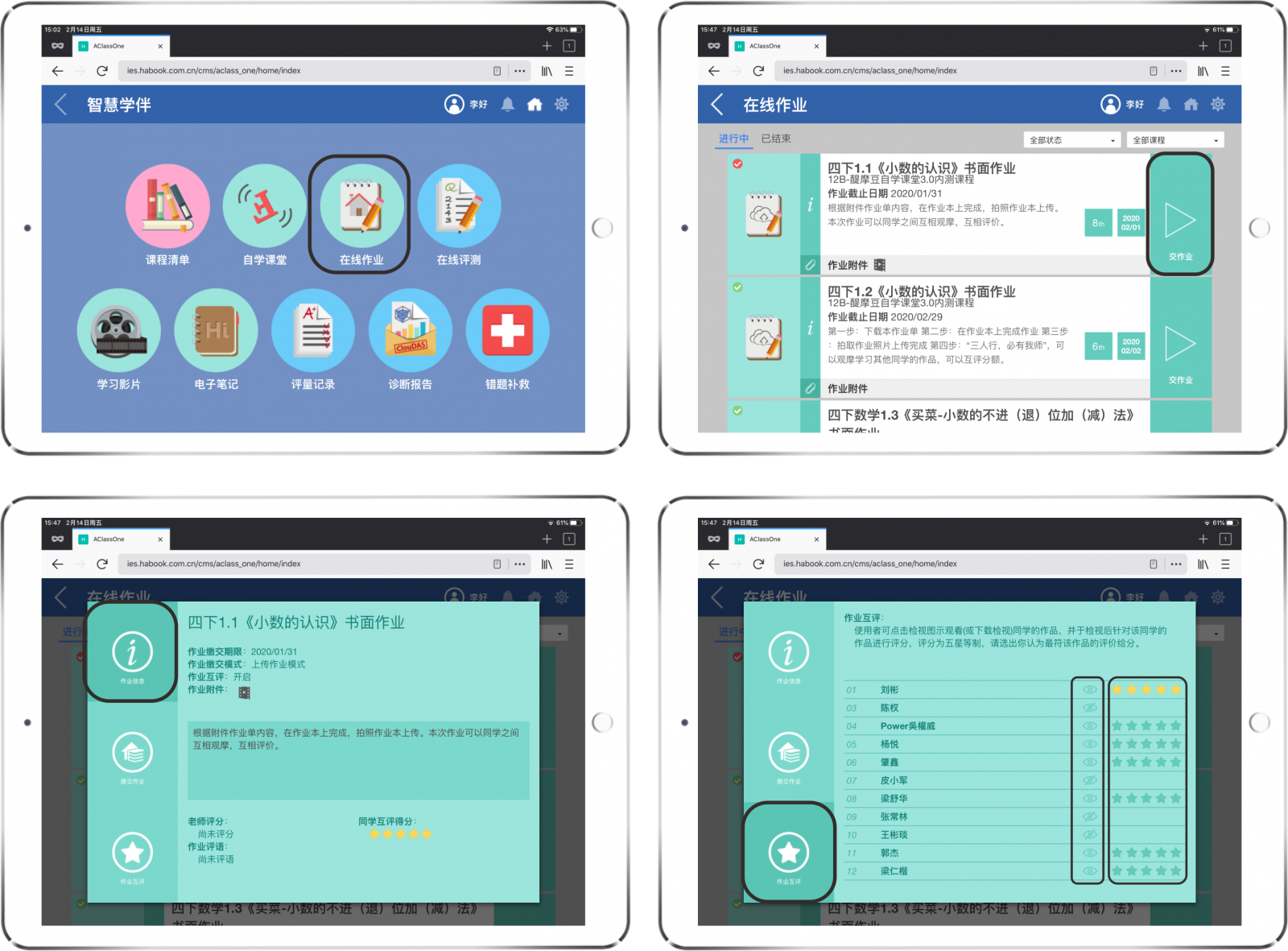 在主頁點(diǎn)擊在線作業(yè),選擇章節(jié),點(diǎn)擊交作業(yè)按鈕,可在作業(yè)資訊里查看其他同學(xué)給予自己的評(píng)分情況,也可以點(diǎn)擊作業(yè)互評(píng),眼睛按鈕查看對應(yīng)同學(xué)的作業(yè)單,星星按鈕對同學(xué)的作業(yè)單進(jìn)行評(píng)分。