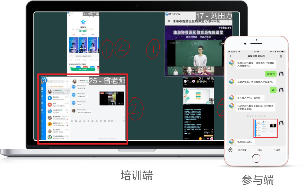 線上培訓(xùn)都采取本地+遠(yuǎn)端的線上線下混合模式,培訓(xùn)的過程中,培訓(xùn)老師運(yùn)用 HiTeach 智慧教室系統(tǒng)搭配在線直播平臺進(jìn)行 PPT 講解,參培人員通過微信公眾號“醍摩豆智慧服務(wù)”或者 AClassOne 智 慧學(xué)伴 APP 輸入課程代碼進(jìn)入培訓(xùn)班級,即可與培訓(xùn)老師輕松互動。
