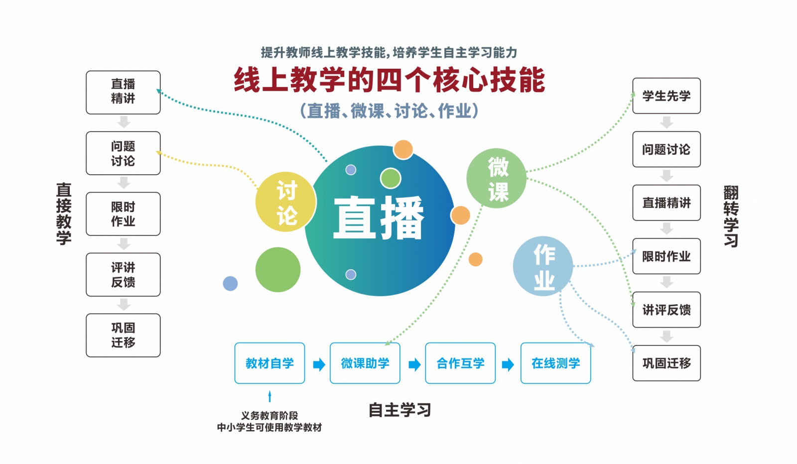 培訓(xùn)的主題為《醍摩豆自學(xué)課堂及組合型生態(tài)課堂如何做?》,為各位參培老師講解了如何運(yùn)用“直播課堂+醍摩豆自學(xué)課堂”為不同學(xué)段、不同地區(qū)的AI智慧學(xué)校建設(shè)“線上線下混合型”學(xué)習(xí)模式。并指出線上教學(xué)的四個(gè)核心技能分別是:直播、微課、討論、作業(yè)。