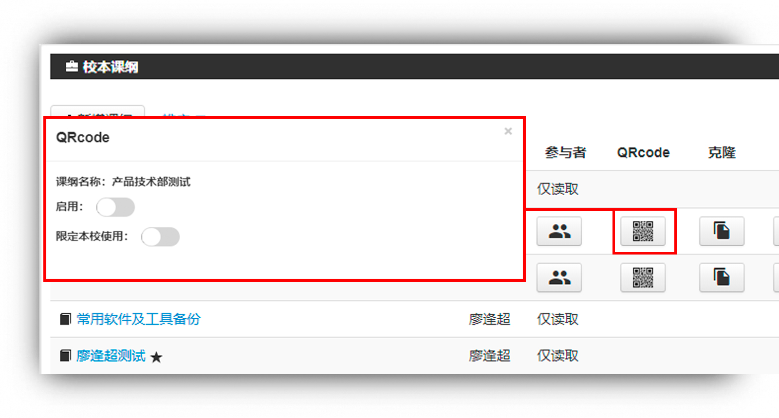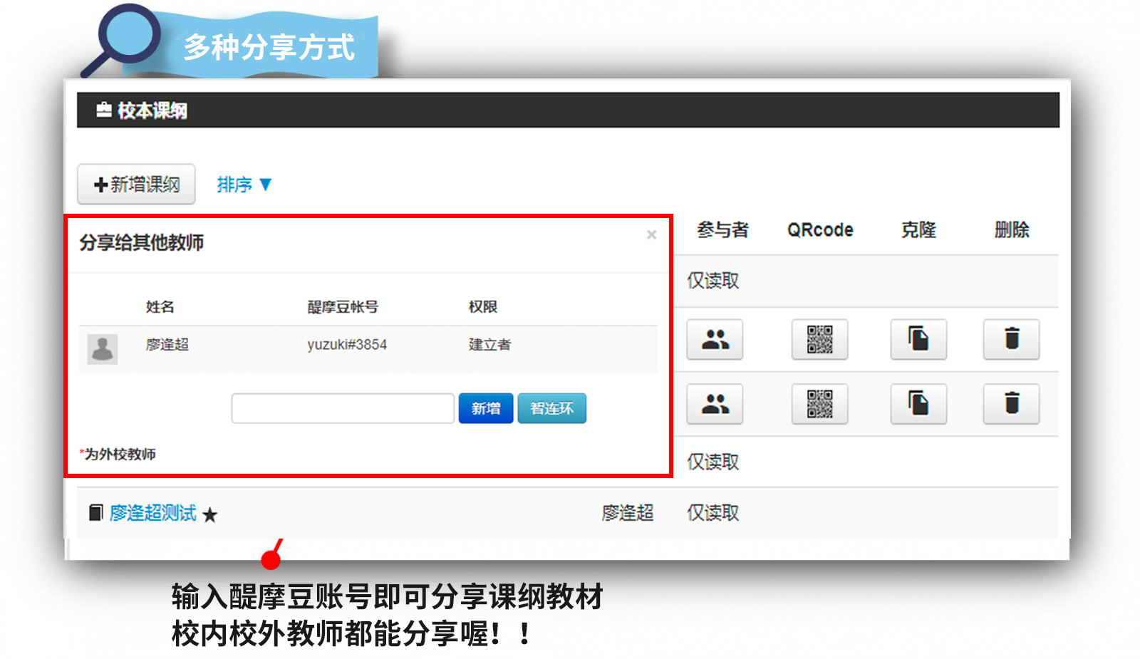 建立好的課綱可以分享給校內(nèi)的老師,課綱擁有者只要選擇校內(nèi)預(yù)計(jì)分享的其他老師醍摩豆賬號,即可自主完成分享。此外,如果需要分享給很多人,則可以利用QRcode掃碼分享的方式來進(jìn)行,取得QRcode的老師,只要利用手機(jī)HiTA app掃碼,即可完成分享,不論校內(nèi)、校外教師伙伴皆可利用此方法取得分享,更方便快速。