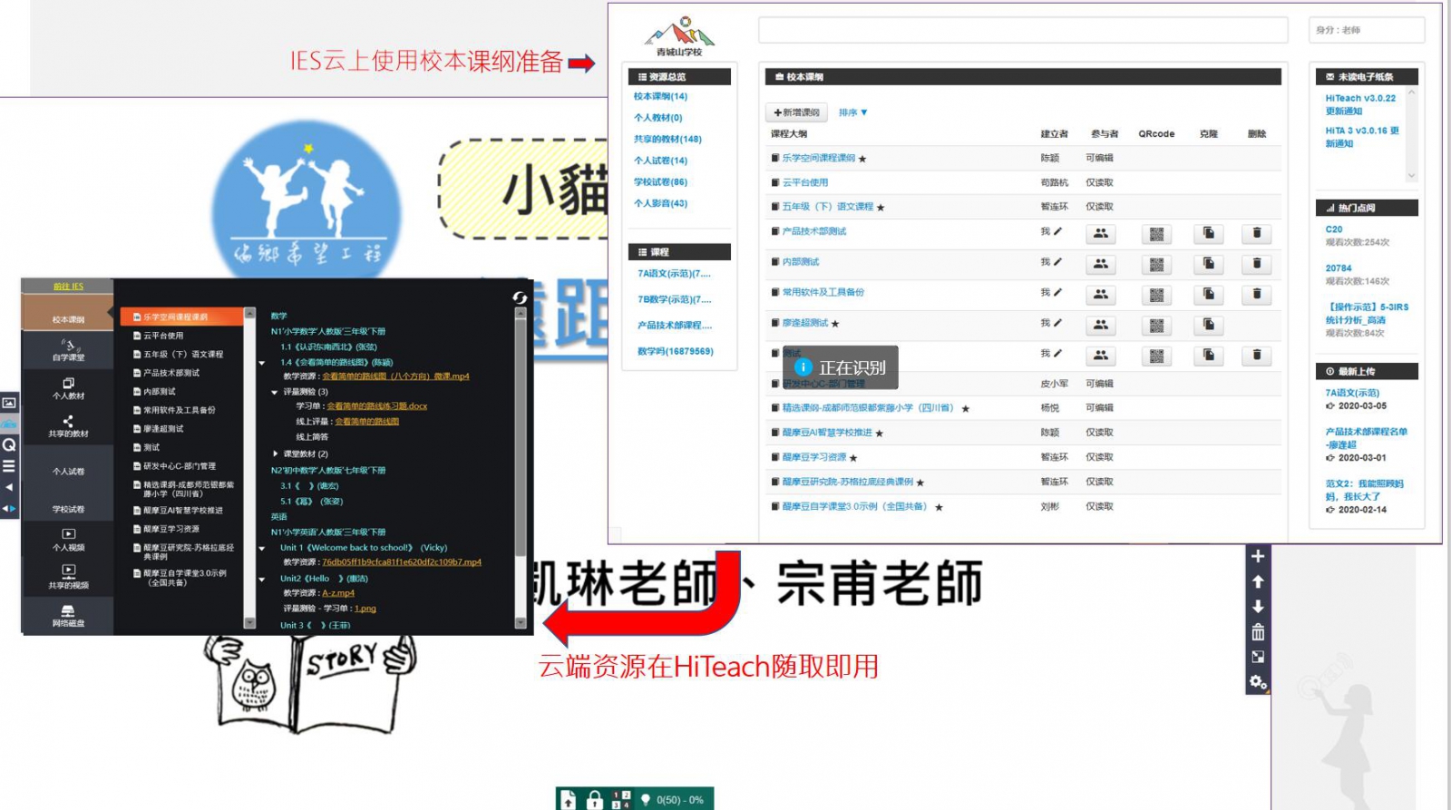 只要計(jì)算機(jī)連上網(wǎng)絡(luò),老師即可利用校本課綱功能進(jìn)行云端備課,將教學(xué)所需的HTE、PPT等教材,或者補(bǔ)充的材料、影片、網(wǎng)頁超連結(jié)等放在課綱中。在智慧教室上課時,利用HiTeach智慧教學(xué)系統(tǒng)的側(cè)邊板就會顯示云端上的課綱教材,供老師在課堂上隨取即用。