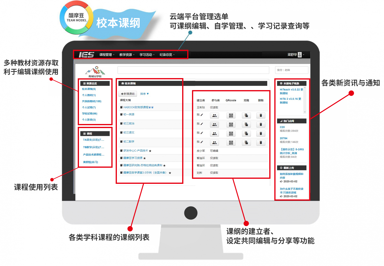 老師透過計(jì)算機(jī)的瀏覽器使用IES智慧教學(xué)服務(wù),可以非常方便地管理教學(xué)資源。其中,校本課綱中可以新增與編輯個人的課綱,也能夠取用學(xué)校社群分享與共用的課綱資源。學(xué)校社群可以根據(jù)教育部的課綱規(guī)范原則共備,達(dá)到部定課程的校本化,此外,學(xué)校本位課程發(fā)展或教師專業(yè)發(fā)展課程也能夠藉由校本課綱的系統(tǒng)化整合教學(xué)資源,讓學(xué)校及教師們有效執(zhí)行,實(shí)現(xiàn)學(xué)校個別化特色愿景。