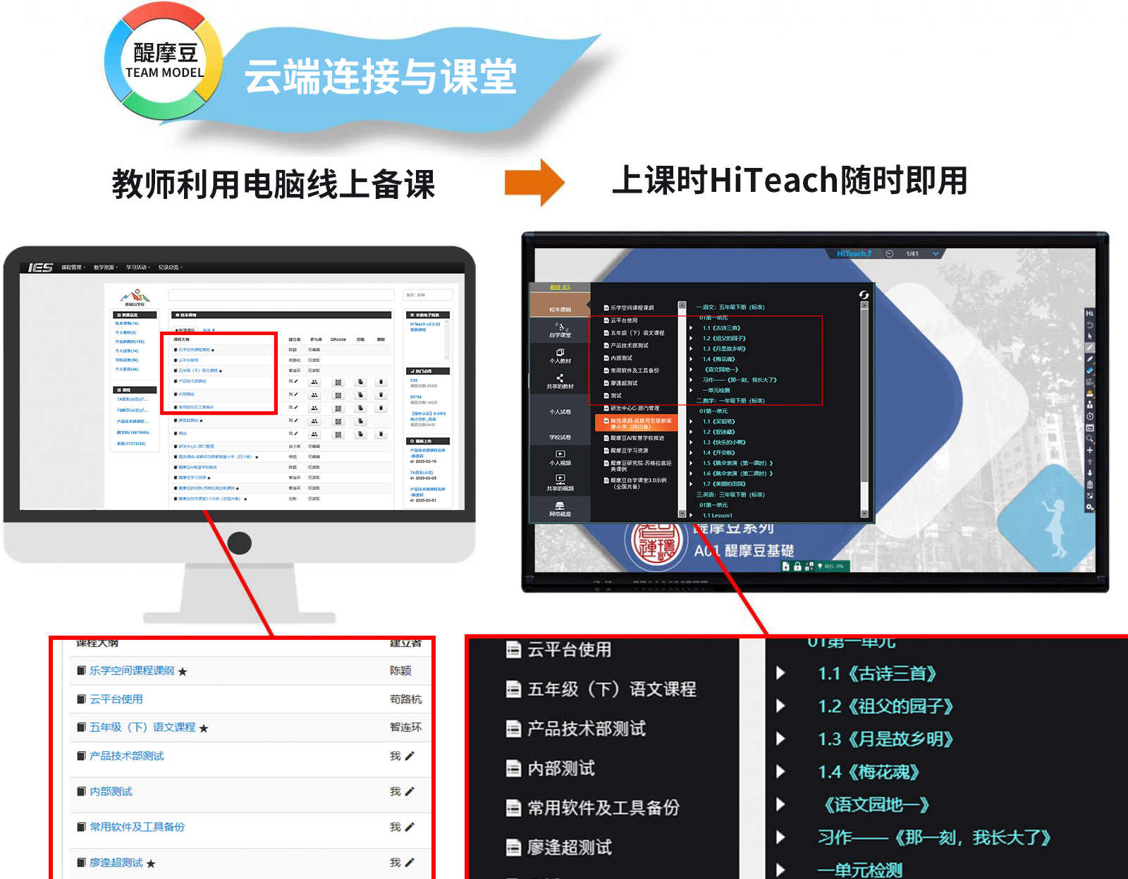 備課,是每一位老師日常工作的重點(diǎn)之一。因此,如何利用云端技術(shù),把備課云端化,讓老師結(jié)構(gòu)化備課,便利存取,并能夠在智慧教室的環(huán)境中隨取即用,同時滿足在線、線下的教與學(xué)需求,就需要一個好的支持系統(tǒng)來協(xié)助。醍摩豆云平臺的IES智慧教學(xué)服務(wù),就提供了「校本課綱」功能,幫助老師做好備課工作。