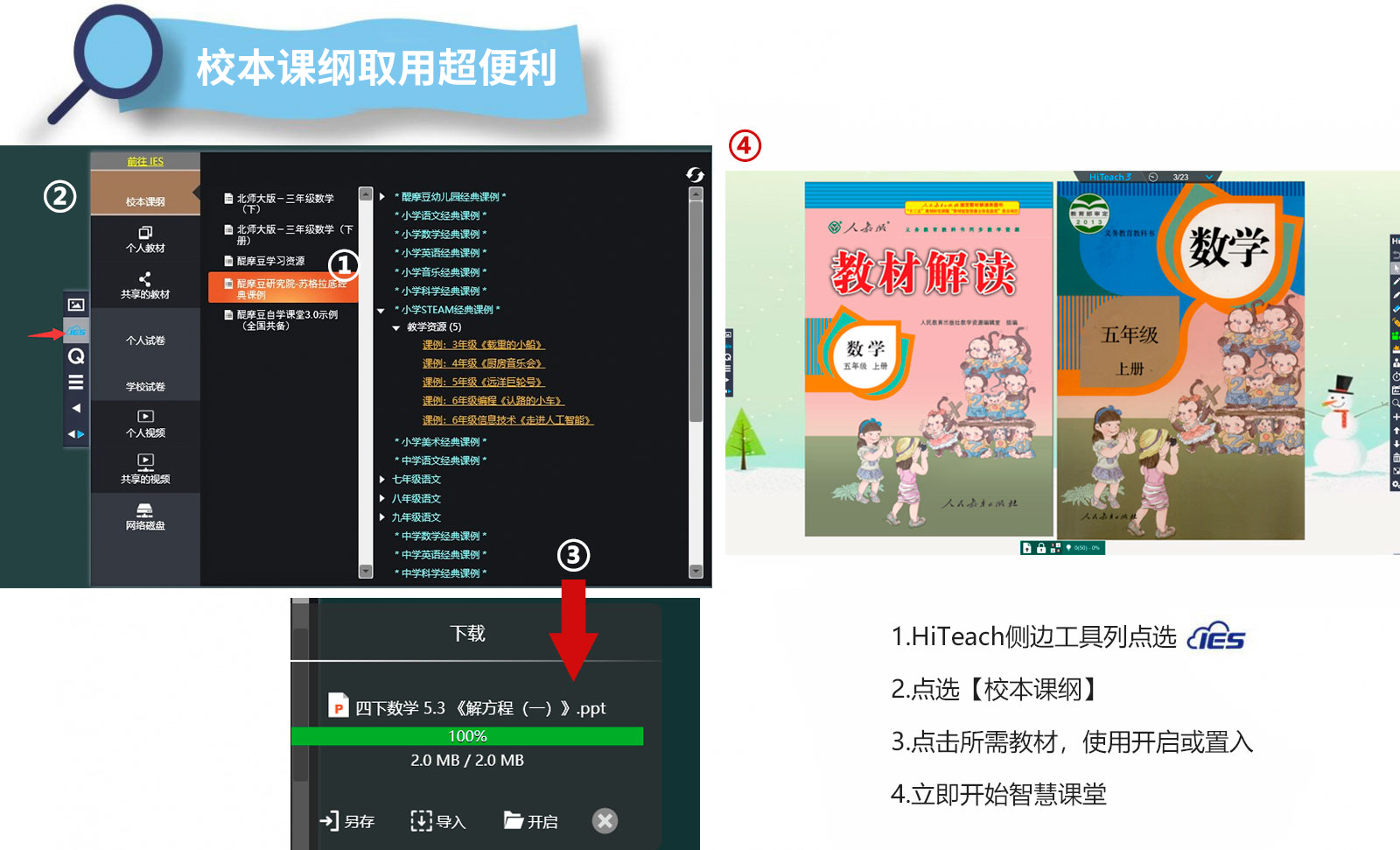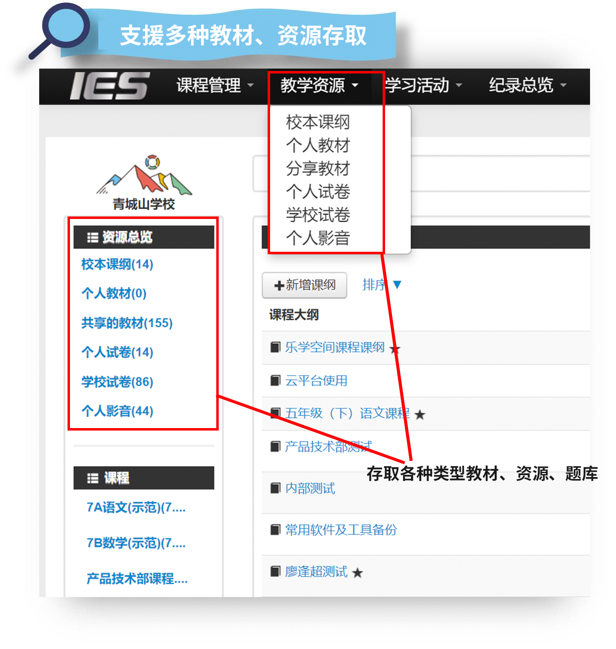 在IES平臺上,教師可上傳各類教材資源(多種格式檔案、影音、題庫等),方便教師在校本課綱中備課時即可安排使用。