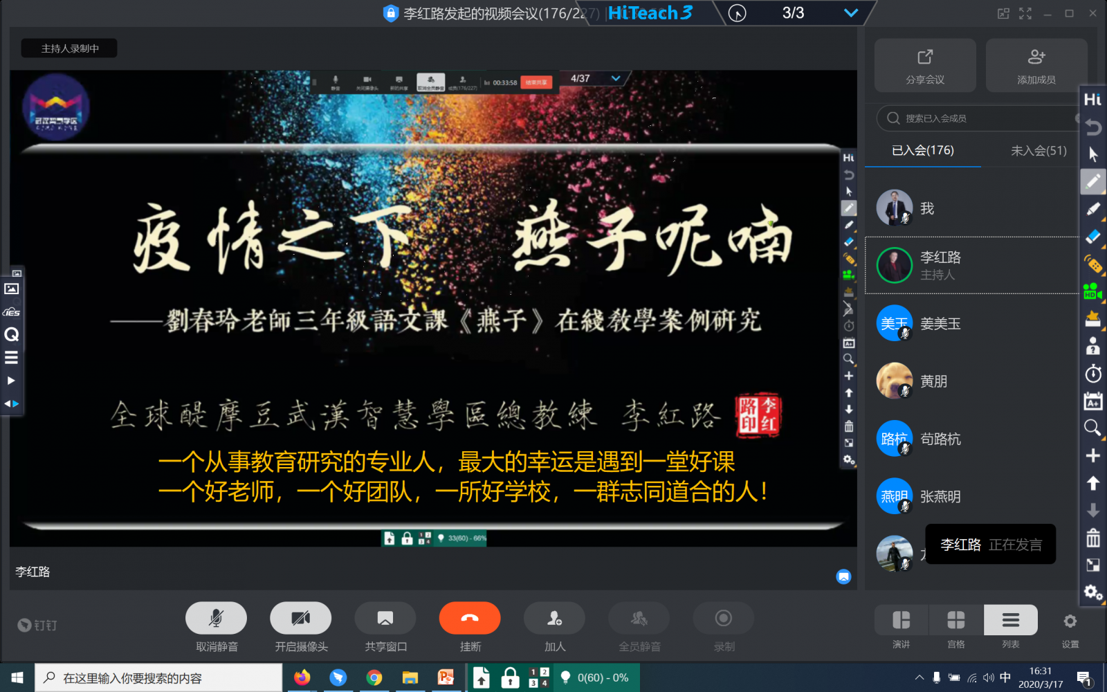 隨后,全球醍摩豆武漢智慧學(xué)區(qū)總教練李紅路主任作了關(guān)于《燕子》課例研究的培訓(xùn)報告。李主任將分享報告聚焦在“線上教學(xué)”,并從在線學(xué)習(xí)的基本理論問題、核心問題、教學(xué)模式、經(jīng)典案例四個板塊分享了如何在疫情期間敲開“線上教學(xué)之門”,并說到“下一代的遠(yuǎn)程教育,是互動性的遠(yuǎn)程教育”。