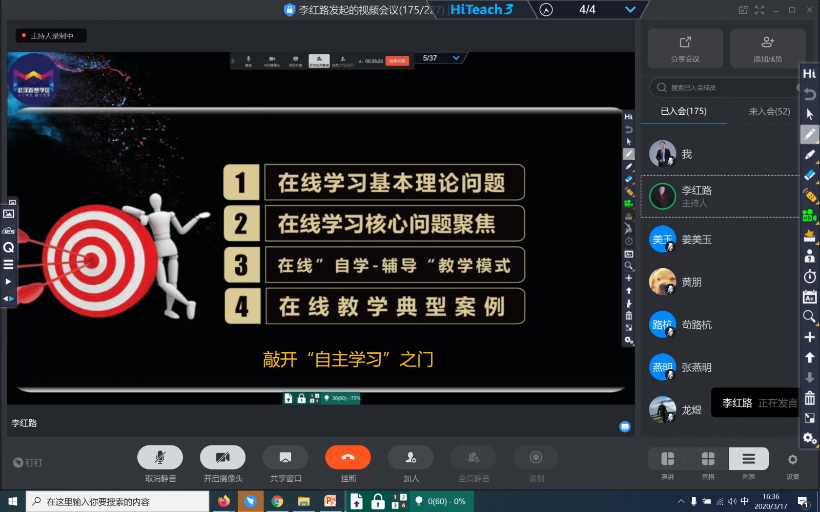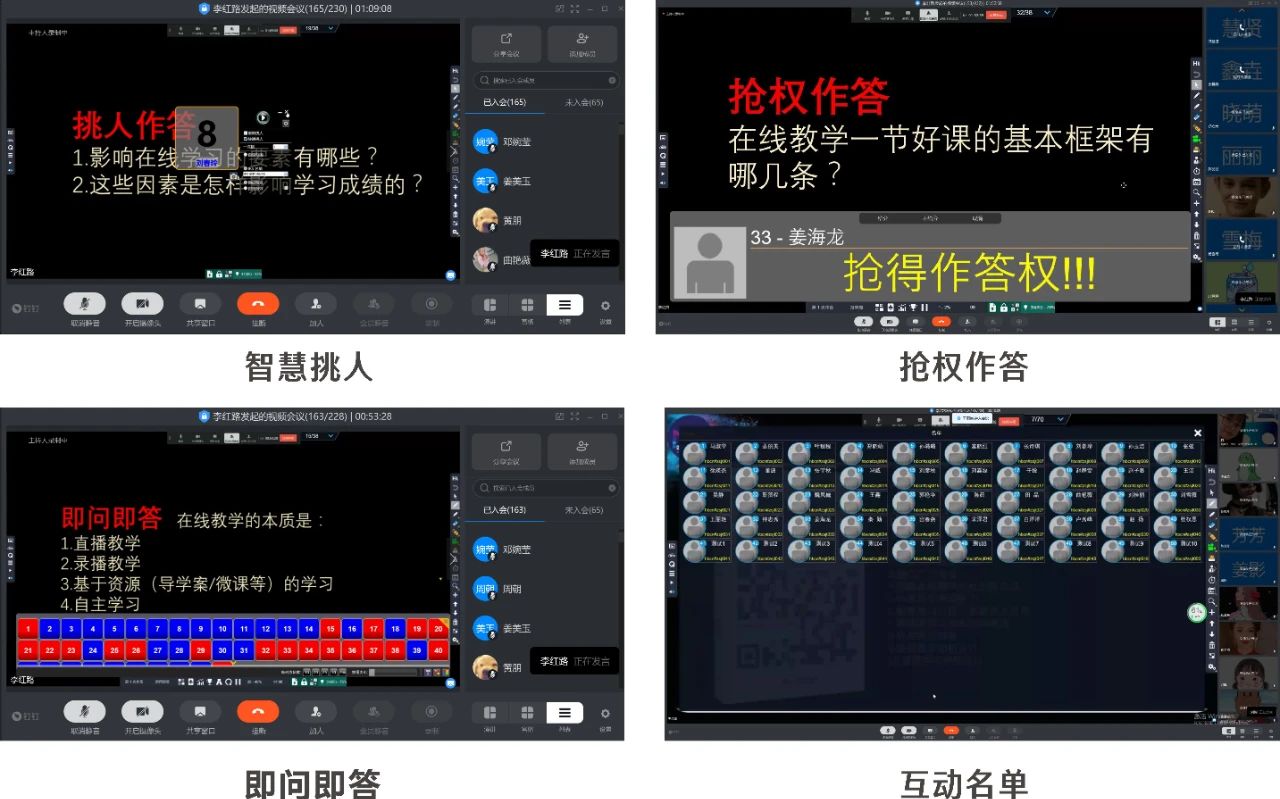 在分享過程中,李主任通過HiTeach智慧教學(xué)系統(tǒng)的即問即答、智慧挑人、搶權(quán)作答等互動工具,與參與直播教研的老師們進(jìn)行互動,線上培訓(xùn)不僅僅是培訓(xùn)老師一人的課堂,通過互動,讓更多的老師參與到線上教學(xué)模式的討論中來,分享在疫情期間老師們的心得體會以及教學(xué)心得。