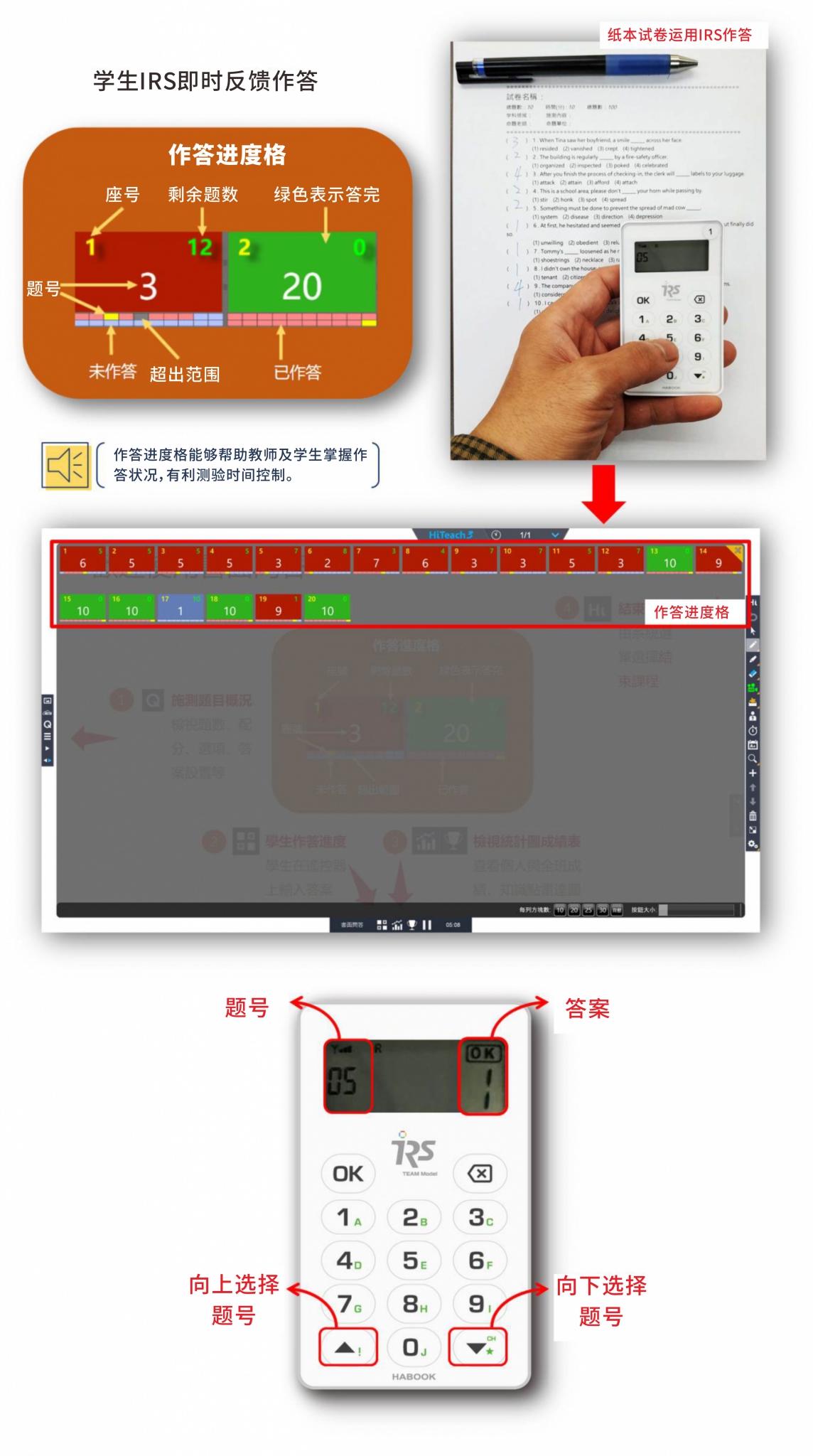學生利用IRS實時反饋系統(tǒng)遙控器輸入試卷答案(單選/復選皆可),遙控器屏幕也能夠顯示題號及答案,遙控器的上下鍵可操作作答題號切換,作答的進度可以展示在白板的HiTeach上,讓老師與學生皆能掌握作答狀況。