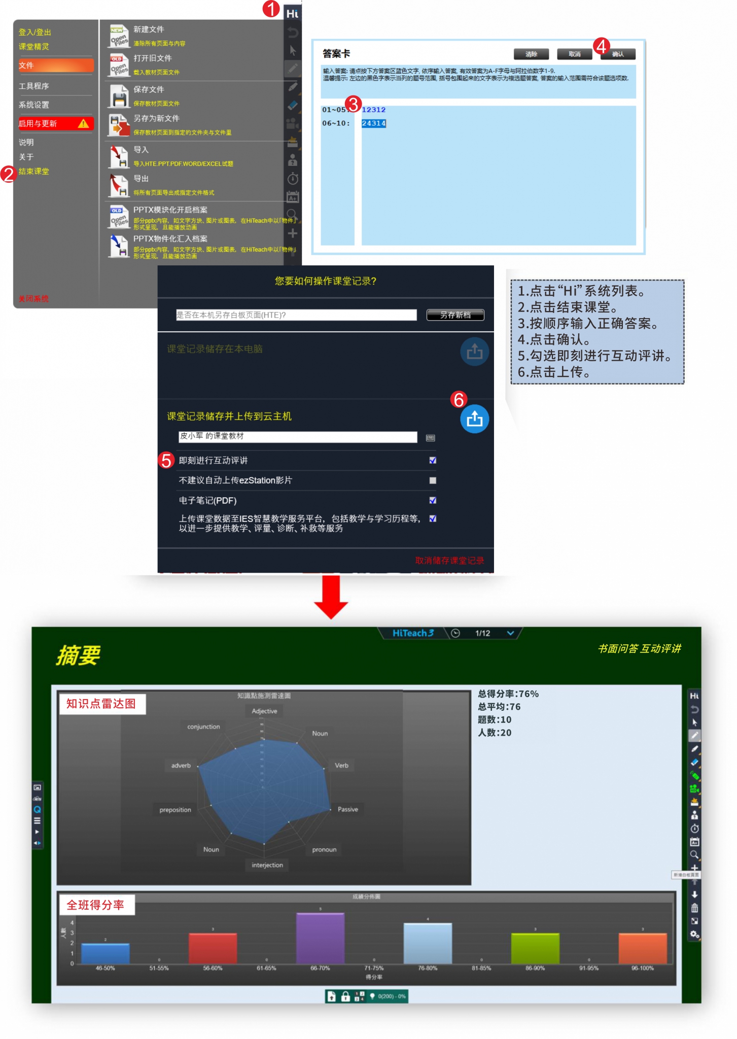 測驗完成后即可進入自動批改環(huán)節(jié),結束課堂、在答案卡輸入正確答案,HiTeach智慧教學系統(tǒng)就會自動進行批改,省去繁重的試卷批改時間,直接就可以進行互動評講模式。