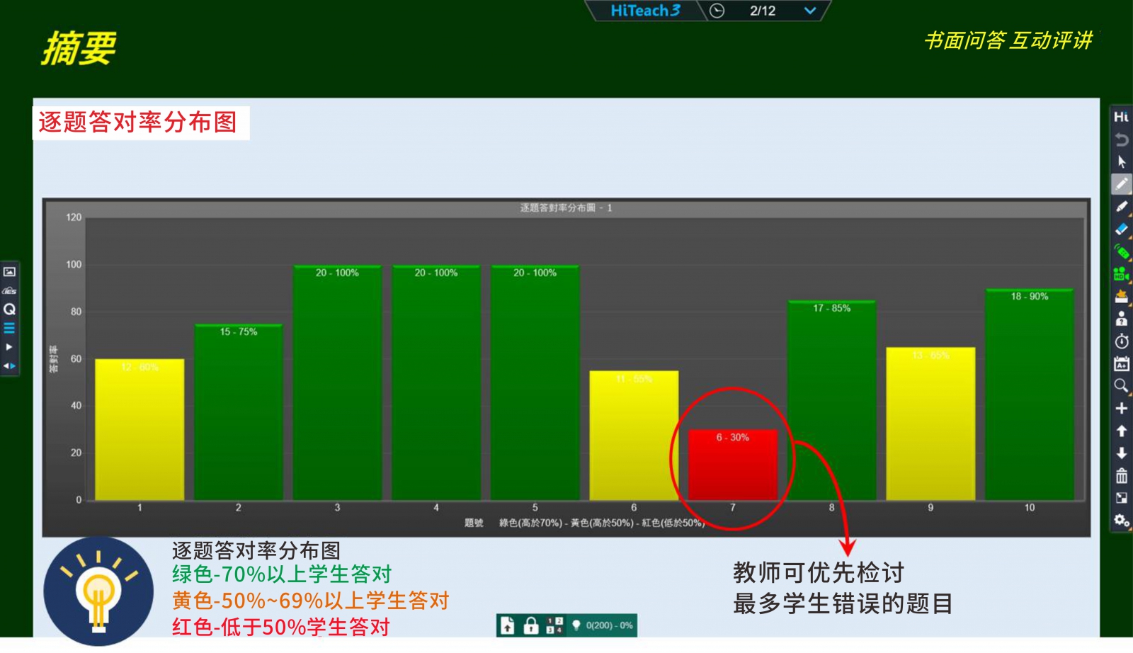 一般教學狀況在進行錯題檢討時,教師往往需要時間統(tǒng)計出哪些試題是學生的弱項,進而對癥下藥。而現(xiàn)在完成書面問答后可即刻進行互動評講,且教師可運用一系列統(tǒng)計圖表進行教學決策,讓錯題檢討的效率更提高。