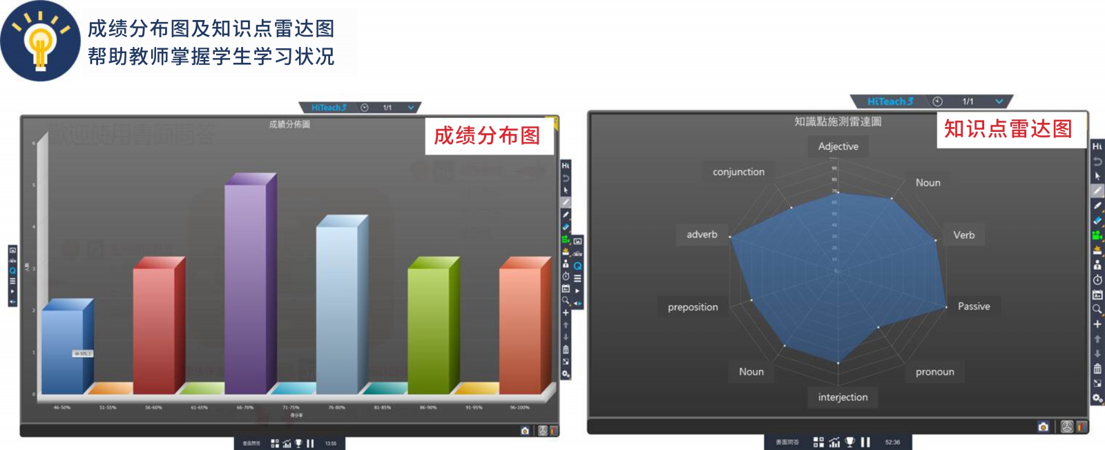 教師可透過成績分布圖了解學生對測驗成績的分布;知識點雷達圖能夠看見學生對各知識點的理解程度,教師就可以做出更精準的教學策略。