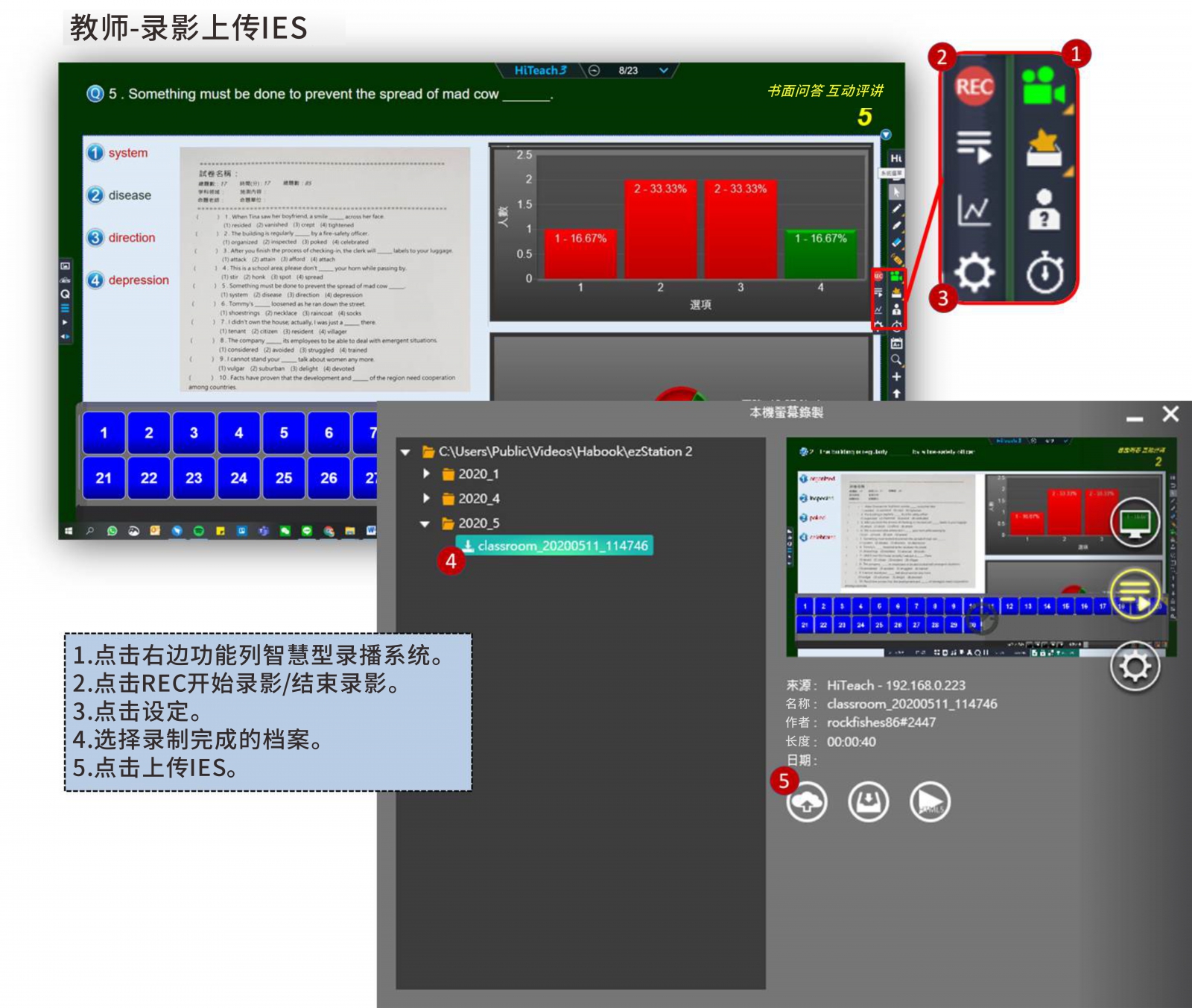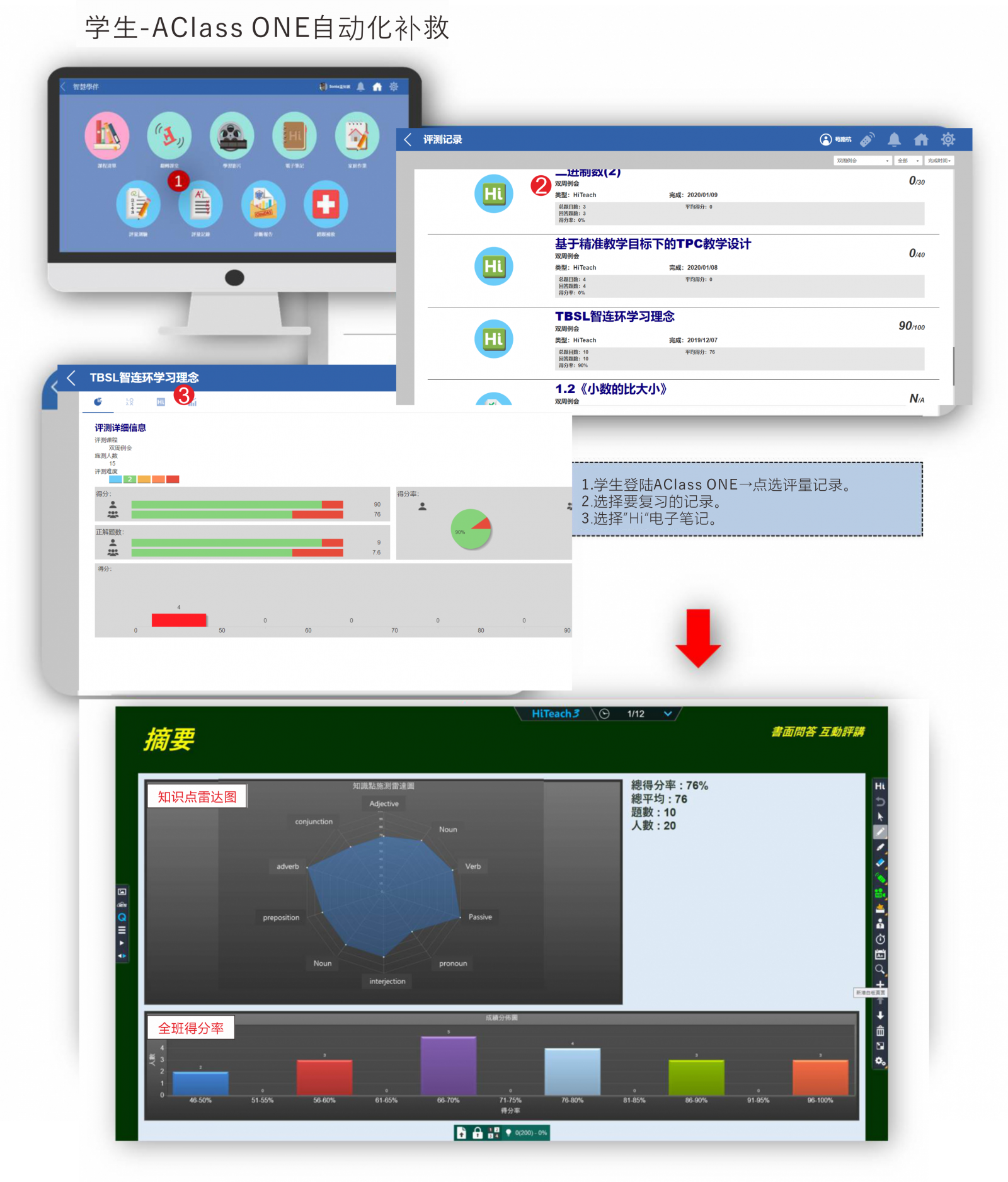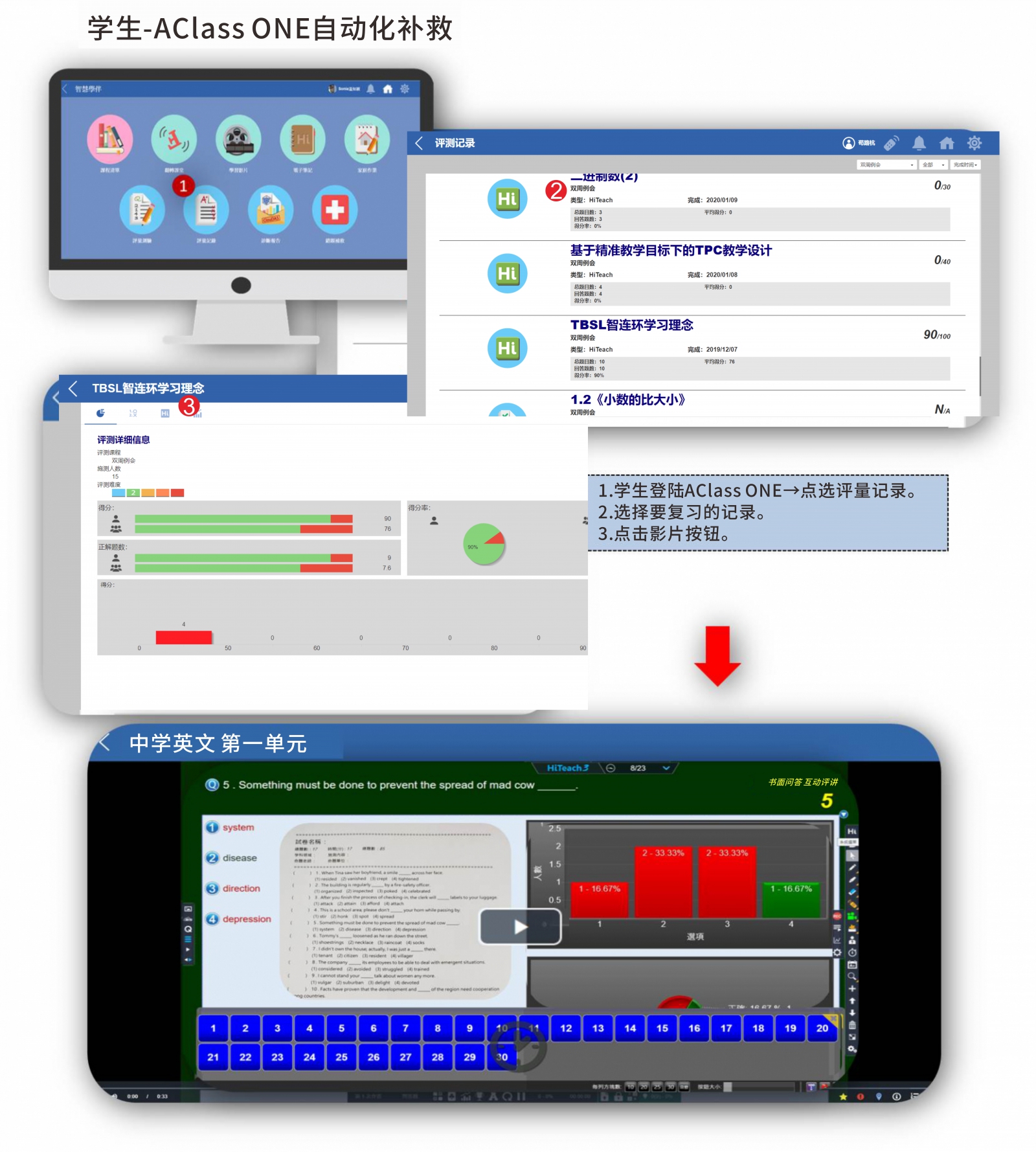 除了教師評講的頁面可傳出電子筆記讓學生回家復習之外,整個互動評講的過程也可透過HiTeach的桌面錄制功能錄成影片,讓學生透過AClass ONE智慧學伴復習,達到學生自主學習,實現(xiàn)自動化補救的目的。