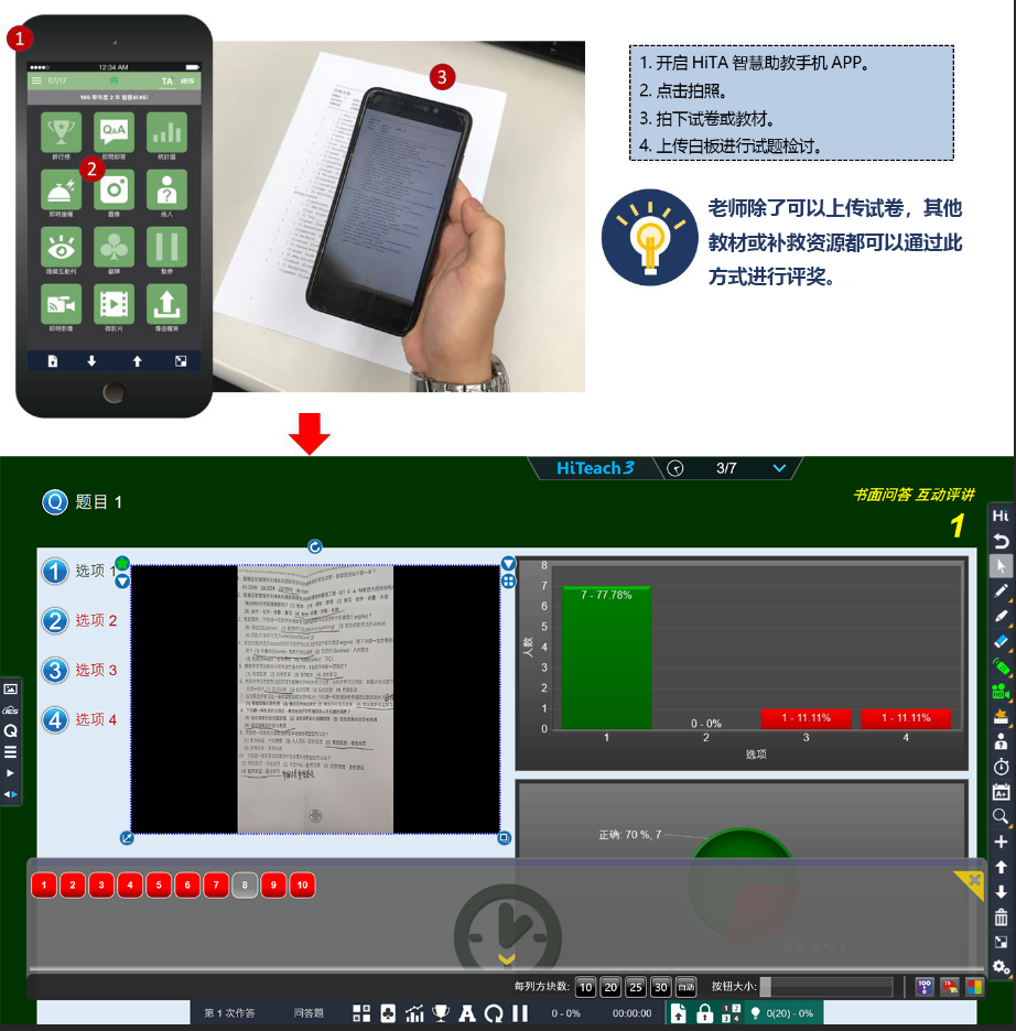 HiTeach的互動評講模式能夠運用評量的統(tǒng)計數(shù)據(jù),利用白板進行解題說明,但因為沒有課前編題的過程,所以在進行互動評講結束匯出電子筆記時,并不會有試題、選項的內容,此時教師只要運用HiTA智慧助教手機APP,將實體的試卷、詳解等以拍照上傳的方式,傳送到HiTeach的頁面上,評講結束后,就會連同電子筆記傳送到IES云端,那么學生課后即可使用AClass ONE智慧學伴看到試卷與老師的解題,達到自動化補救的效益,結合錯題補救的功能,復習起來就更有效率了。