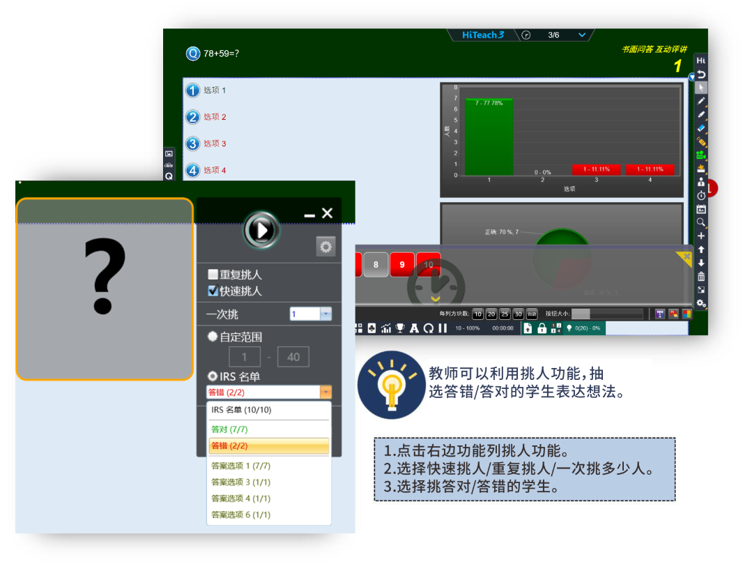 教師在進行互動評講時,如果教師想讓選擇不同答案的學生表達想法,可以利用挑人的功能,選擇答對或答錯的學生發(fā)表想法,達到智慧挑人的目的。