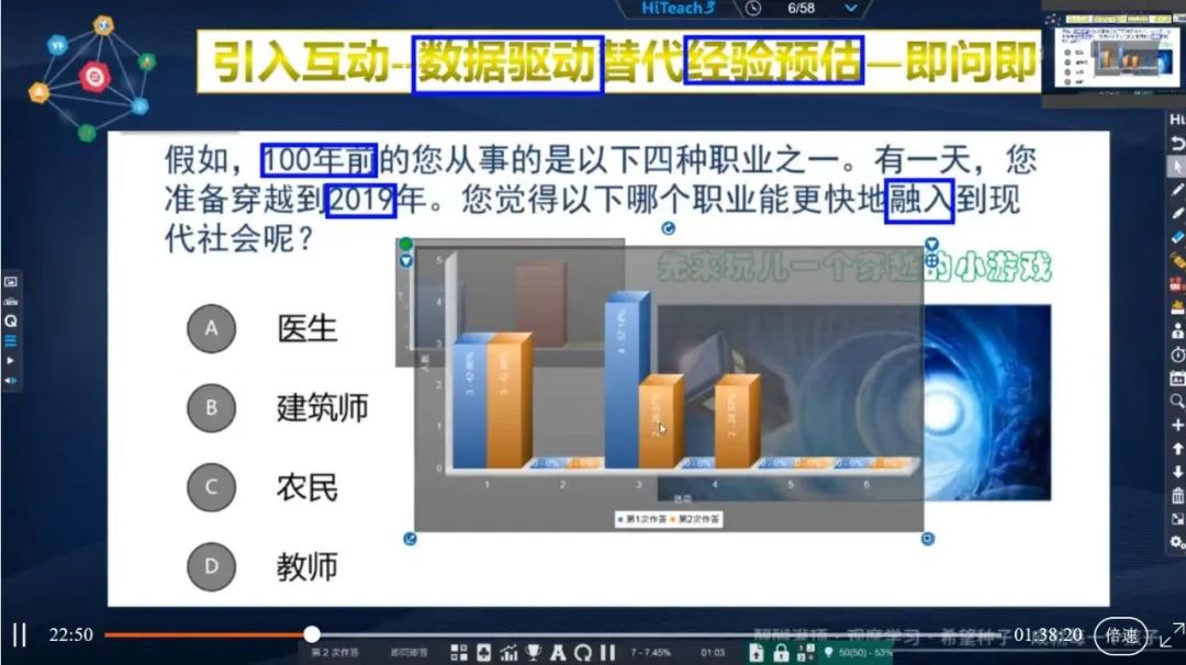 老師們運(yùn)用手機(jī)進(jìn)行選擇回答,回答結(jié)束后産生的數(shù)據(jù)圖表則作為主講老師的參考依據(jù),