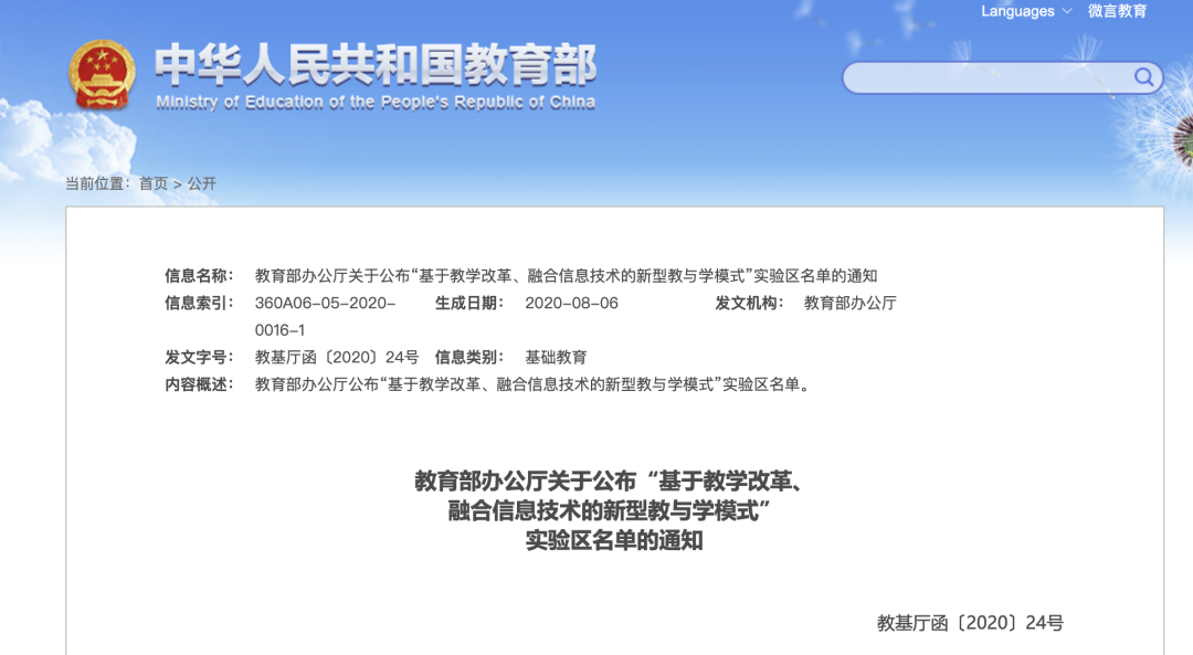經(jīng)遴選推薦、專家評(píng)審、公示等環(huán)節(jié),2020年8月6日,教育部確定了“基于教學(xué)改革、融合信息技術(shù)的新型教與學(xué)模式”實(shí)驗(yàn)區(qū)名單。