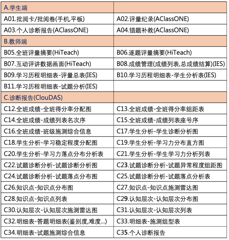 學生手機輸入答題卡,簡單操作后就能完成書面問答作業(yè),自動產出大量數據分析報表和應用服務,包括學生端應用、教師端應用和診斷分析報告(ClouDAS)等三類,下面列出35種自動產出的數據分析報表與應用服務,以便隨時檢索和應用。