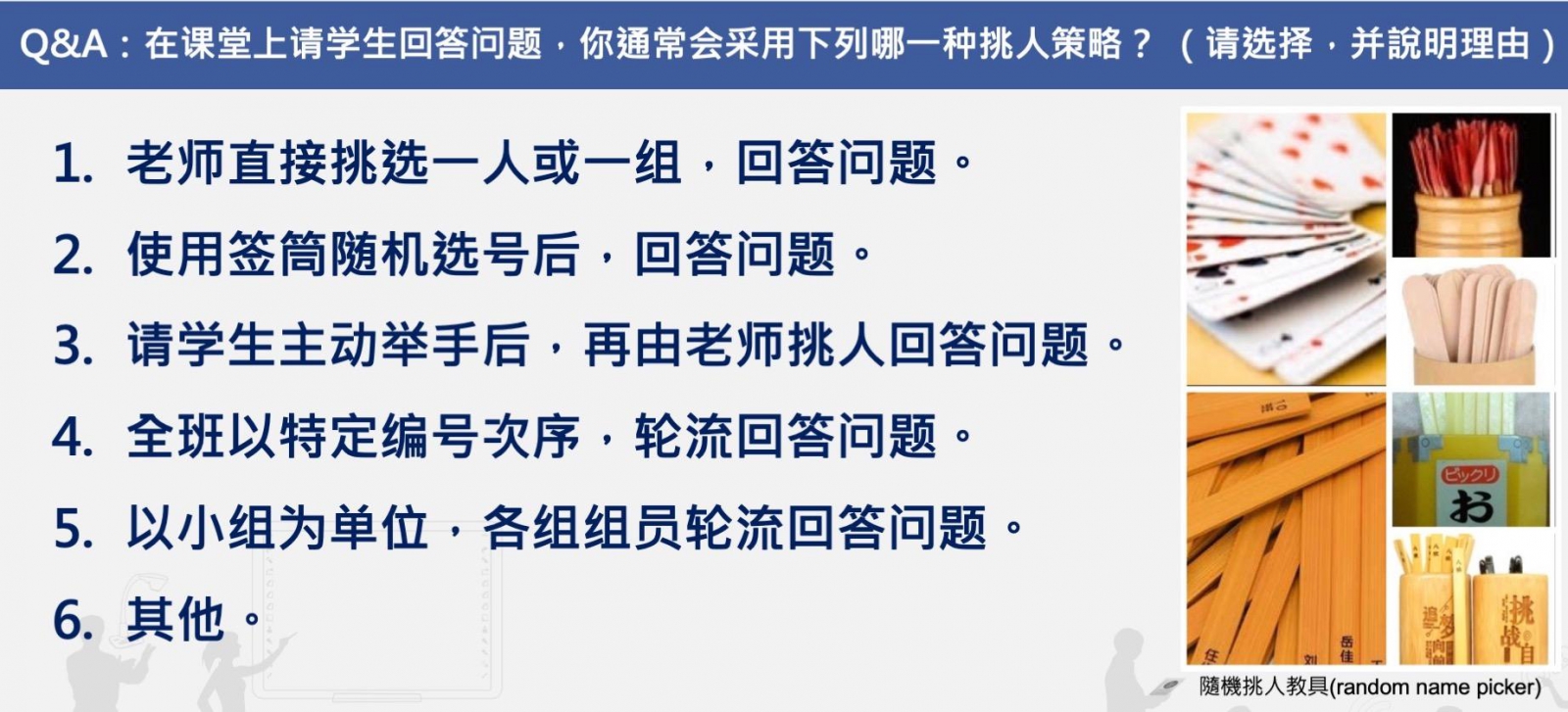 下面這個(gè)調(diào)查,請(qǐng)你先來猜一猜,哪一個(gè)項(xiàng)目是最多老師采用的挑人策略? Q&A:在課堂上請(qǐng)學(xué)生回答問題,你通常會(huì)采用下列哪一種挑人策略?(請(qǐng)選擇,并說明理由)