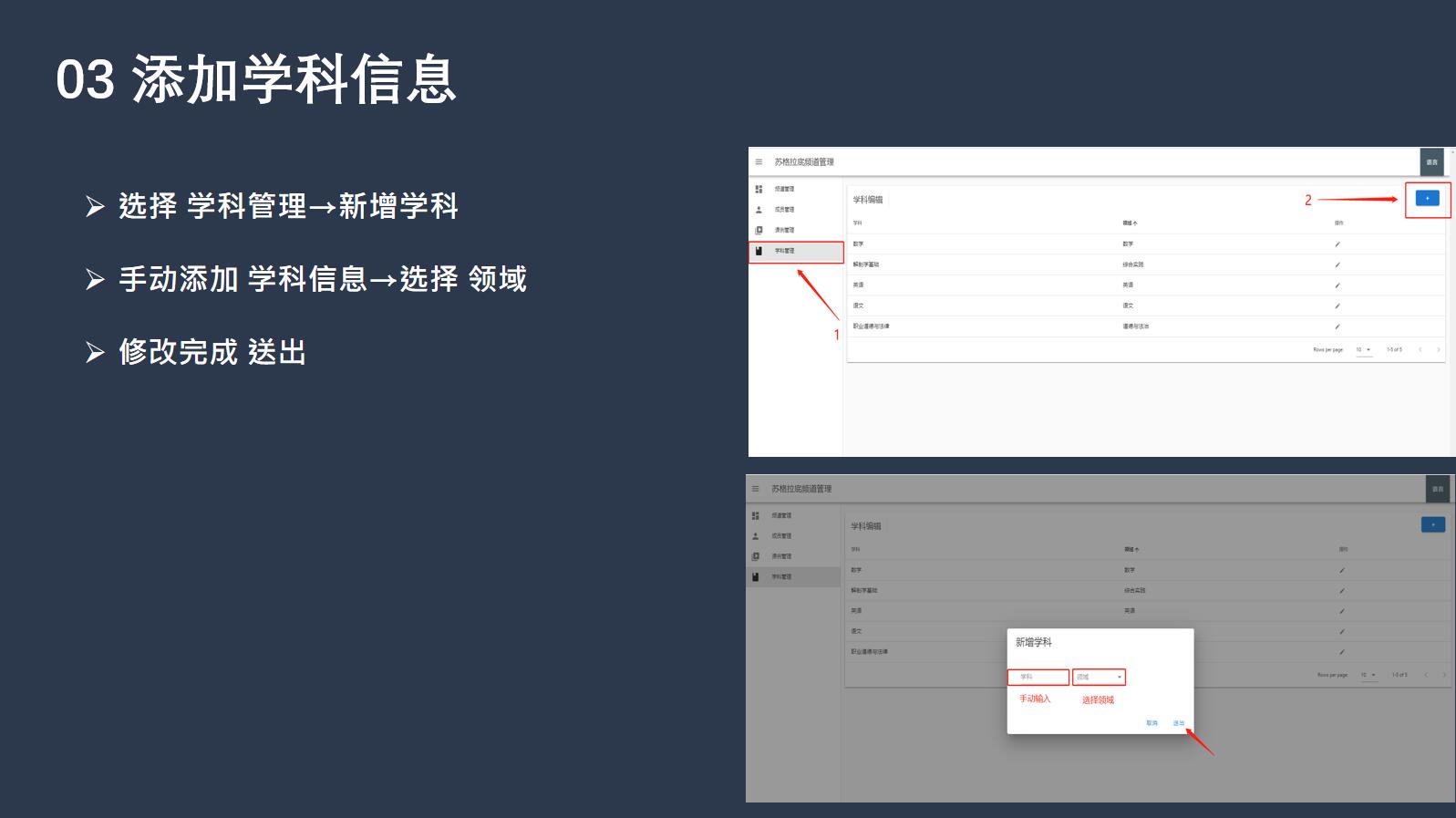 3、添加學(xué)科信息 01.選擇 學(xué)科管理→新增學(xué)科