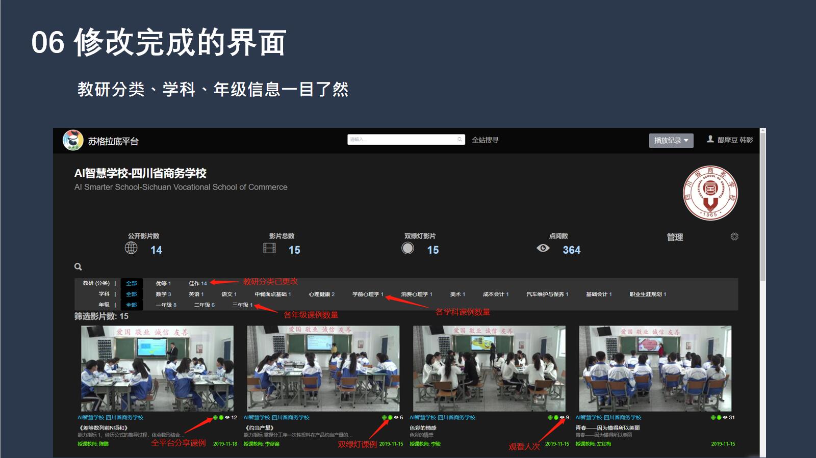蘇格拉底平臺匯集上萬部精彩教案與教學(xué)實例影片,建立AI智慧學(xué)校專屬頻道,提供全球智慧教師們一個公開觀摩與討論交流的教師發(fā)展平臺,推動智慧教育擴(kuò)散、加速教師專業(yè)發(fā)展。通過蘇格拉底平臺,搭建教師展示課堂、互評互學(xué)的環(huán)境,形成智慧課堂視頻的云端資料庫,匯聚最精彩、智慧連環(huán)的課堂視頻,凝聚教師專業(yè)發(fā)展的課堂智慧,提供全校教師搜尋學(xué)科領(lǐng)域、學(xué)習(xí)階段、教法特征、點評標(biāo)記等,就像在百度搜尋資料,騰訊搜尋視頻,快速搜尋要觀摩的視頻、課例。