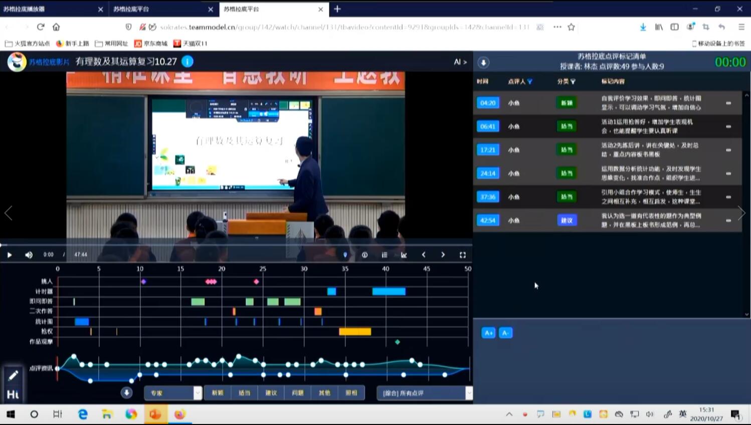 本次活動(dòng)的智慧教研環(huán)節(jié)在醍摩豆AI教研中心順利展開,醍摩豆AI教研中心具有自動(dòng)采集課例、團(tuán)隊(duì)共同議課、數(shù)據(jù)證據(jù)分析、模式切片研討、建立課程體系五大特點(diǎn)。參加本次活動(dòng)的線上教研專家有:廣州市花都區(qū)培新中學(xué)數(shù)學(xué)科教研組劉碧茹組長、珠海容閎書院教學(xué)處楊萬里主任、浙江藍(lán)潤天使外國語實(shí)驗(yàn)學(xué)校校長助理池琪先生。幾位線上點(diǎn)評(píng)專家對(duì)林杰老師本節(jié)課二次作答的運(yùn)用表達(dá)了高度的認(rèn)可,并給出了用思維導(dǎo)圖展示課堂結(jié)構(gòu)的中肯建議。