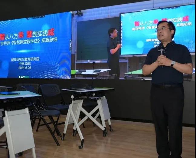 決賽開(kāi)幕式上,醍摩豆智慧教育研究院秘書(shū)長(zhǎng)劉彬教授對(duì)《智慧課堂教學(xué)法》課程教學(xué)實(shí)施進(jìn)行了總結(jié)。他用“智來(lái)之根本、智來(lái)之學(xué)時(shí)、智來(lái)之專(zhuān)家”,簡(jiǎn)要闡述了課程“智從八方來(lái)”的教學(xué)歷程;用“天龍八部”“藏經(jīng)閣”和“AI智慧學(xué)校實(shí)踐基地”生動(dòng)詮釋了同學(xué)們“慧到實(shí)踐成”的實(shí)踐教學(xué)成效;用“做真教育、真做教育”評(píng)價(jià)了南京特殊教育師范學(xué)院為黨育才、為未來(lái)而行的智慧教育改革與實(shí)踐。