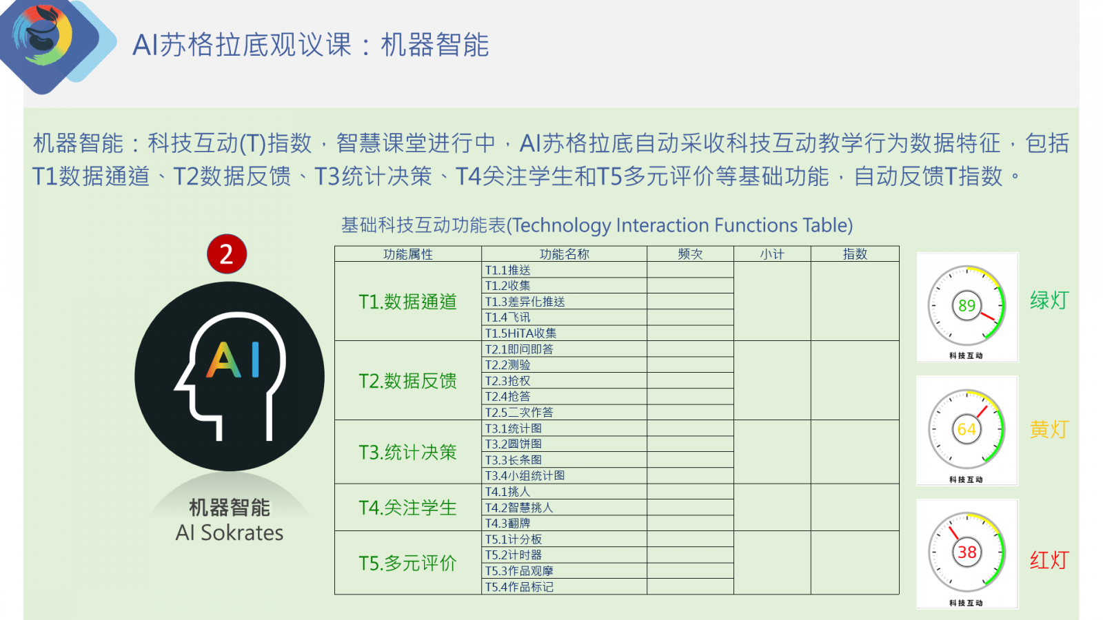 科技互動(T)指數(shù)分為五類分析指標,包括T1.數(shù)據(jù)通道、T2.數(shù)據(jù)反饋、T3.統(tǒng)計決策、T4.關(guān)注學生和T5.多元評價等基礎互動功能分項,統(tǒng)計分析每一分項之頻次與有效組合應用,并給出分項指數(shù)和總指數(shù)??萍蓟又笖?shù)(0-99),70分以上為顯示為綠燈,50-70分黃燈,50分以下為紅燈。適當科技互動功能應用組合,可獲得較高指數(shù),當科技互動指數(shù)顯示為綠燈時,表示這堂課之科技互動應用達到熟練程度。