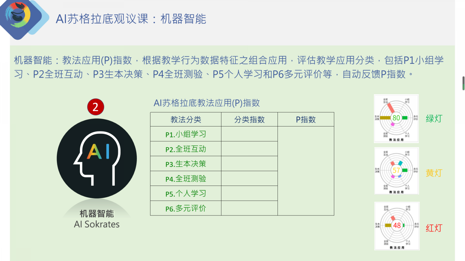 AI蘇格拉底教法應用(P)指數(shù)有六項分析指數(shù),包括P1.小組學習、P2.全班互動、P3.生本決策、P4.全班測驗、P5.個人學習、P6.多元評價等。運用這六項指數(shù),評估教學行為數(shù)據(jù)特征的有效性,有效教學行為數(shù)據(jù)特征越多,可獲得越高指數(shù), 70分以上顯示為綠燈,50-70分黃燈,50分以下為紅燈。