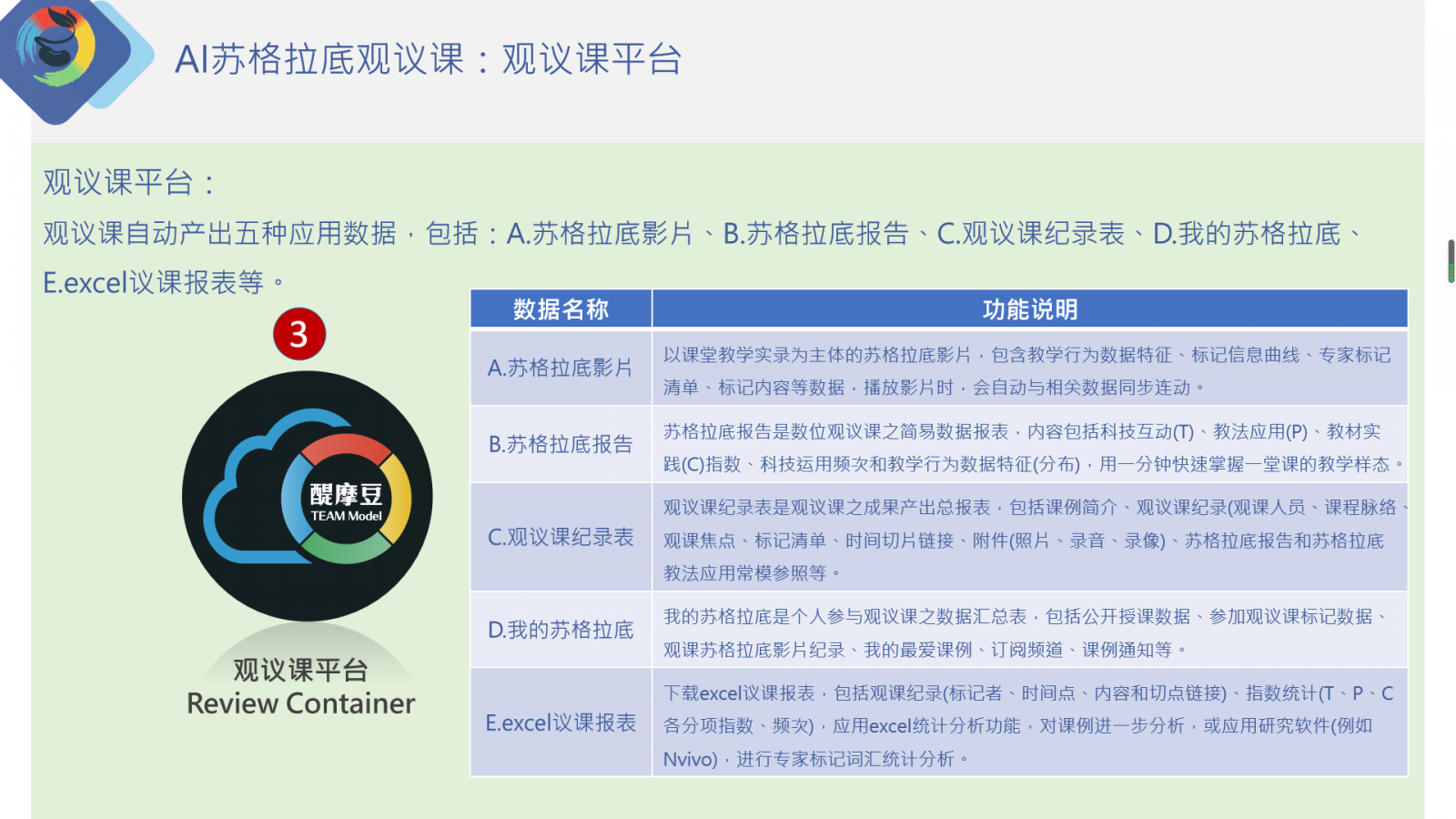 觀議課平臺會自動產(chǎn)出五種主要應用數(shù)據(jù),包括:A.蘇格拉底影片、B.蘇格拉底報告、C.觀議課紀錄表、D.我的蘇格拉底、E.excel議課報表等。