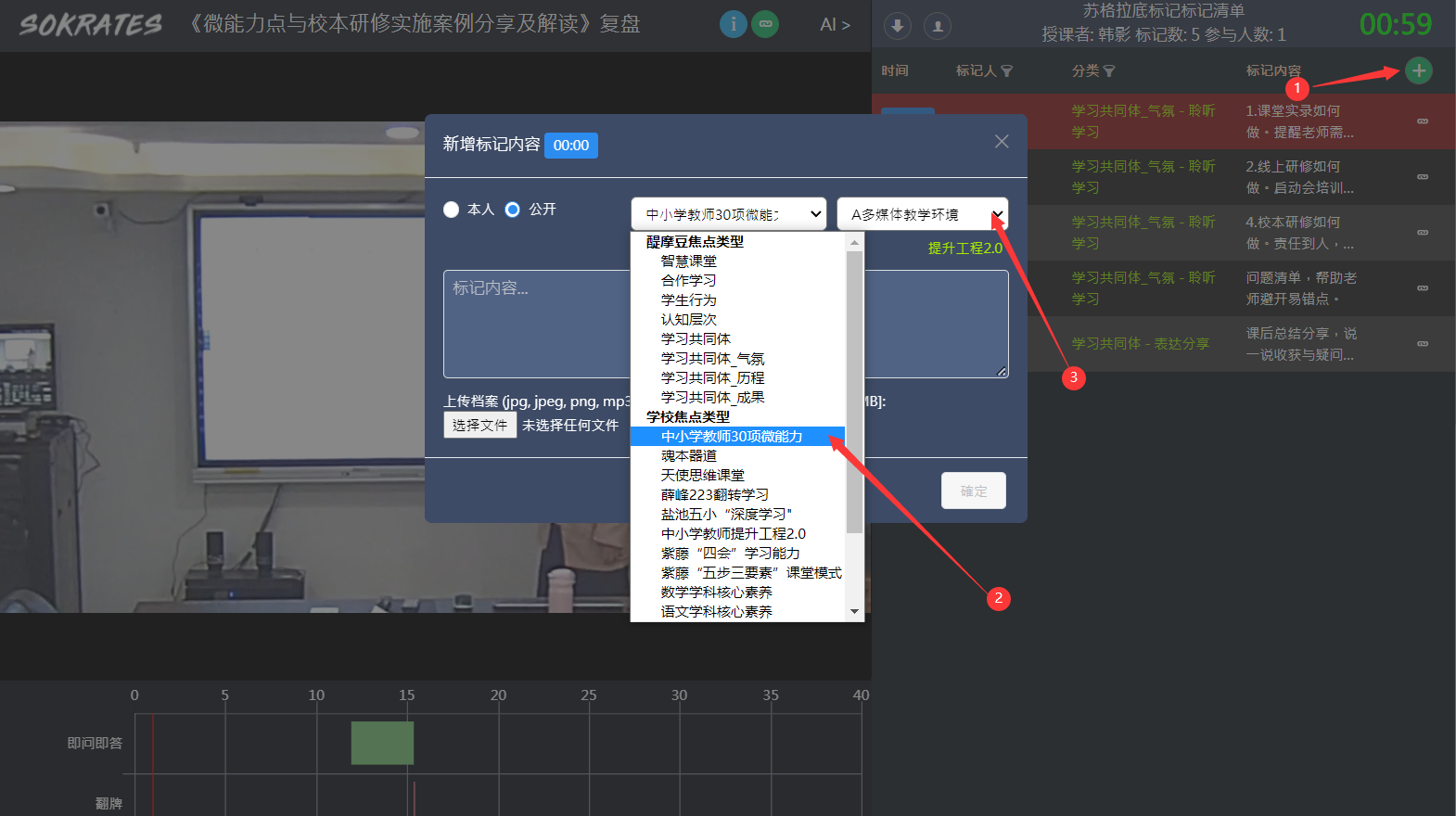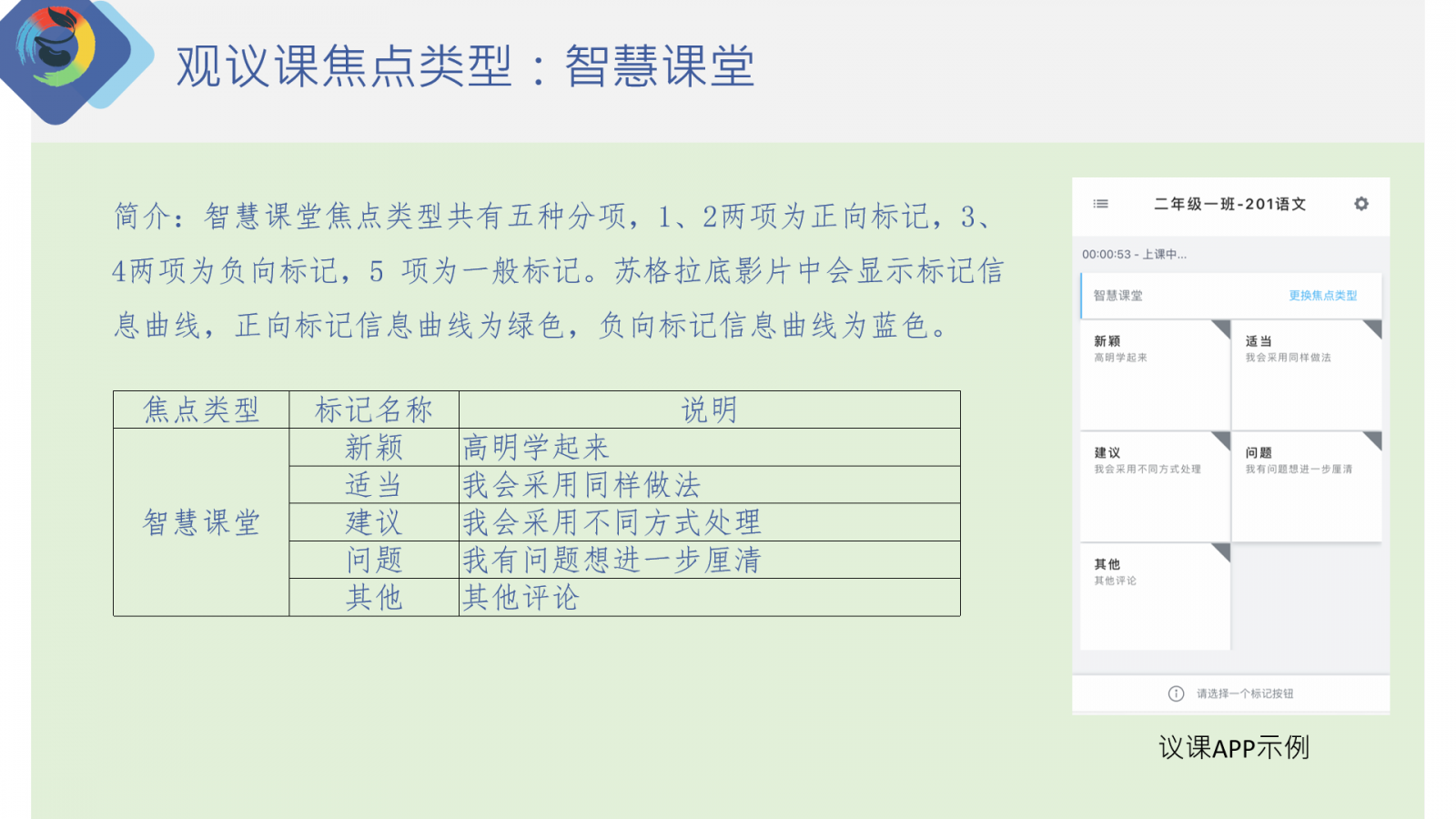 簡介:智慧課堂焦點(diǎn)類型共有五種分項(xiàng),1、2兩項(xiàng)為正向標(biāo)記,3、4兩項(xiàng)為負(fù)向標(biāo)記,5 項(xiàng)為一般標(biāo)記。蘇格拉底影片中會(huì)顯示標(biāo)記信息曲線,正向標(biāo)記信息曲線為綠色,負(fù)向標(biāo)記信息曲線為藍(lán)色。