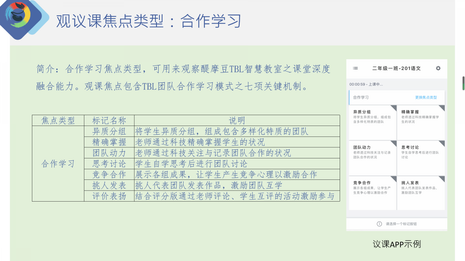 簡介:合作學(xué)習(xí)焦點(diǎn)類型,可用來觀察醍摩豆TBL智慧教室之課堂深度融合能力。觀課焦點(diǎn)包含TBL團(tuán)隊(duì)合作學(xué)習(xí)模式之七項(xiàng)關(guān)鍵機(jī)制。