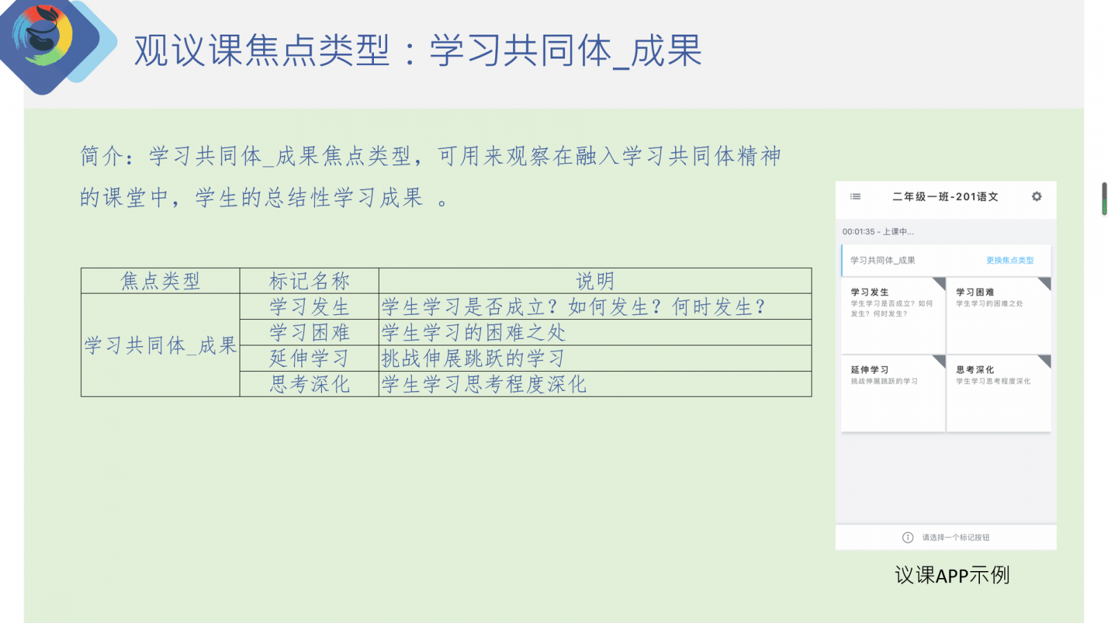 簡介:學(xué)習(xí)共同體_成果焦點(diǎn) 類型,可用來觀察在融入學(xué)習(xí)共同體精神的課堂中,學(xué)生的總結(jié)性學(xué)習(xí)成果 。