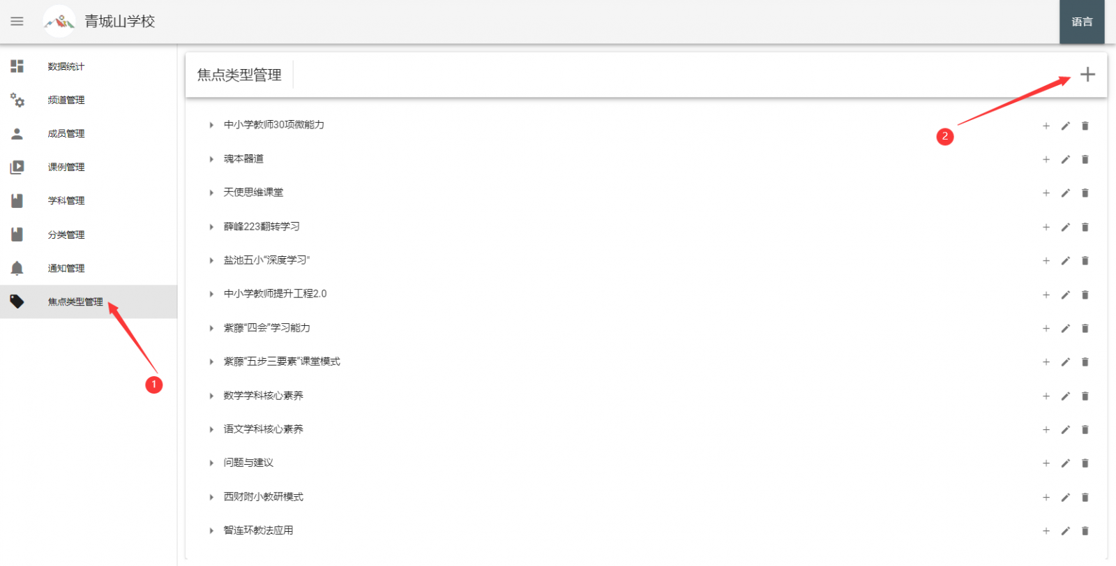 具有專屬頻道(數(shù)位觀議課平臺(tái))管理員權(quán)限的用戶賬號(hào),登入平臺(tái)后,可以建立學(xué)校焦點(diǎn)類型。建立學(xué)校焦點(diǎn)類型的操作流程如下:
