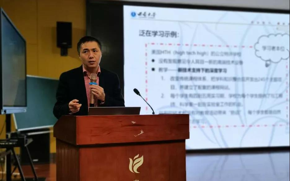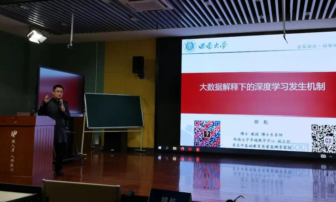 西南大學(xué)卓越教學(xué)中心胡航副主任從大數(shù)據(jù)出發(fā)深入淺出的講解了《大數(shù)據(jù)支持下的深度學(xué)習(xí)發(fā)生機制》。他從2020年高考之怪現(xiàn)象引出深度學(xué)習(xí)是什么,學(xué)什么,怎么學(xué)?深度學(xué)習(xí)可以實現(xiàn)“三角(認知、心理、生理)互證”。并用案例、數(shù)據(jù)對深度學(xué)習(xí)的模型、關(guān)鍵詞進行有力支撐。