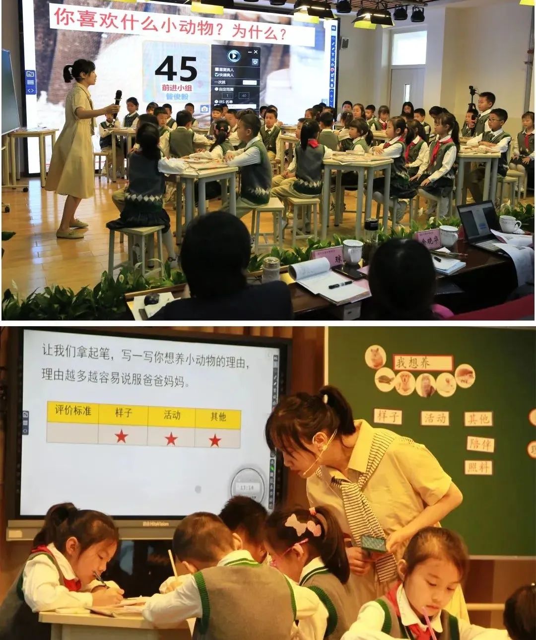 課堂展示 王新瓊老師和周永峰老師分別代表二年級語文組和五年級數(shù)學(xué)組,就張雅紅老師執(zhí)教的《我想養(yǎng)小動物》以及林俊老師執(zhí)教的《郵票的張數(shù)》進(jìn)行課前陳述。 張雅紅老師執(zhí)教的《我想養(yǎng)小動物》,創(chuàng)設(shè)情景,激發(fā)學(xué)生表達(dá)真感受;搭建支架,引導(dǎo)學(xué)生表達(dá)更清楚;以評促寫,激勵學(xué)生表達(dá)有方向。孩子們在老師的引導(dǎo)下,理由充分,表達(dá)清楚,成功說服爸爸媽媽,將“小動物”領(lǐng)養(yǎng)回家。課堂上,醍摩豆智慧挑人激發(fā)學(xué)生積極性,拍照上傳讓課堂反饋可視化。