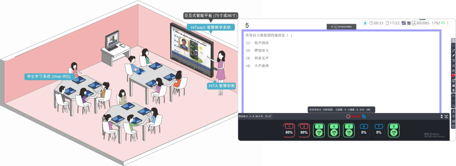 通過HiTeach 5智慧教學(xué)系統(tǒng)的即問即答功能搭配IRS即時(shí)反饋器,實(shí)現(xiàn)課堂同步互動(dòng)教學(xué)?;?dòng)結(jié)果以可視化的數(shù)據(jù)圖表呈現(xiàn),老師更能夠清楚且客觀的根據(jù)統(tǒng)計(jì)數(shù)據(jù),掌握學(xué)習(xí)狀況。