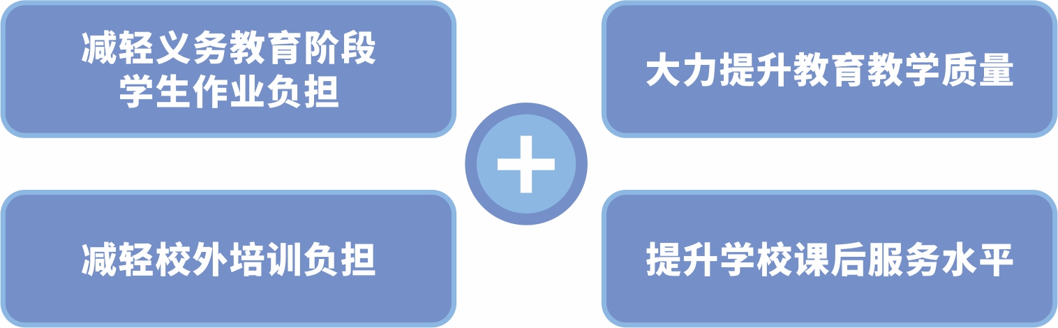 中共中央辦公廳、國務(wù)院辦公廳印發(fā)了《關(guān)于進(jìn)一步減輕義務(wù)教育階段學(xué)生作業(yè)負(fù)擔(dān)和校外培訓(xùn)負(fù)擔(dān)的意見》,旨在切實(shí)提升學(xué)校育人水平,持續(xù)規(guī)范校外培訓(xùn)(包括線上培訓(xùn)和線下培訓(xùn)),有效減輕義務(wù)教育階段學(xué)生過重作業(yè)負(fù)擔(dān)和校外培訓(xùn)負(fù)擔(dān)(簡稱“雙減”)。提出全面壓減作業(yè)總量和時(shí)長,減輕學(xué)生過重作業(yè)負(fù)擔(dān);提升學(xué)校課后服務(wù)水平,滿足學(xué)生多樣化需求;大力提升教育教學(xué)質(zhì)量,確保學(xué)生在校內(nèi)學(xué)足學(xué)好。