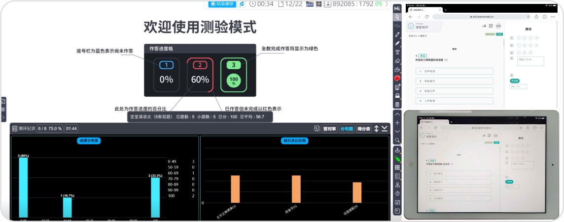 過往紙本試題流程繁復(fù),通過HiTeach創(chuàng)建題目(多選題,判斷題,填空題和綜合題),試題可包含文本、圖片、聲音和影片等多媒體素材,教師端可隨時(shí)掌握學(xué)生的作答進(jìn)度。