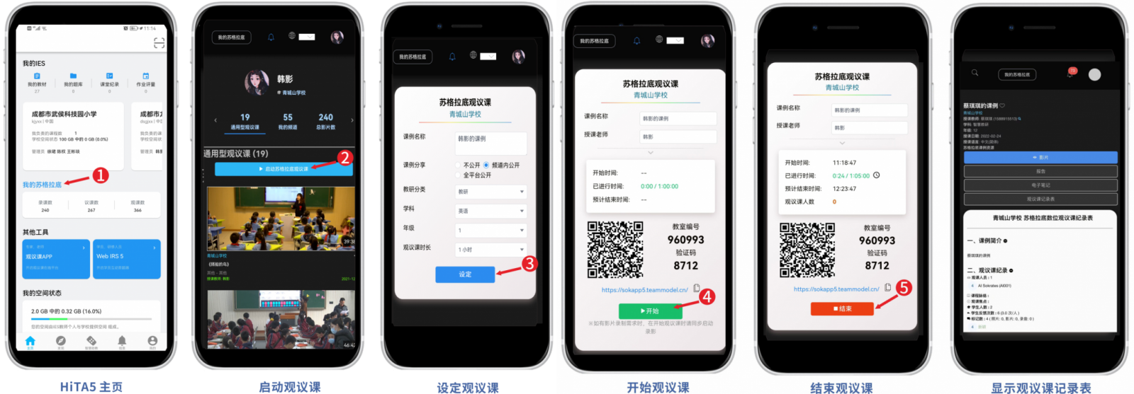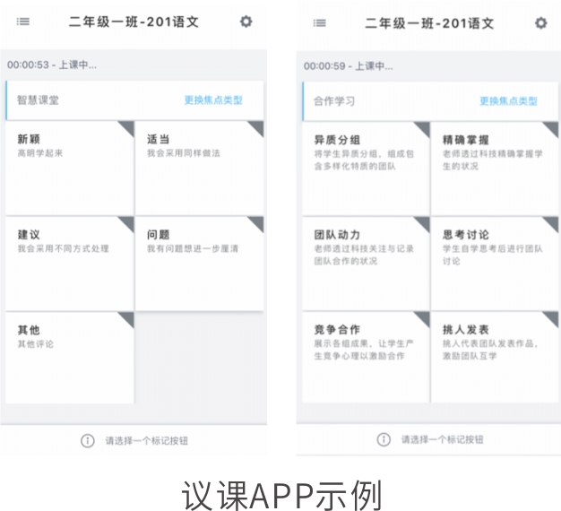 手機(jī)就能夠快速發(fā)起同步觀議課,突破專用數(shù)位觀議課教室限制,在原來班級教室就可以進(jìn)行數(shù)位觀議課。使用APP啟動數(shù)位觀議課活動后,就可開始自動收集所有觀課者(或指導(dǎo)者)的觀課紀(jì)錄,包括文字、照片、錄音和錄像等觀議課標(biāo)記,觀課結(jié)束自動輸出數(shù)位觀議課紀(jì)錄表。手機(jī)端同步觀議課操作功能畫面如下圖,使用HiTA 5醍摩豆教師APP,就能快速啟動、設(shè)定、開始和結(jié)束數(shù)位觀議課。