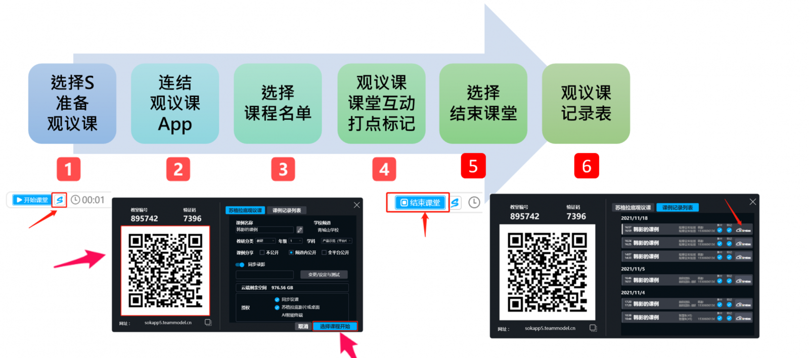 觀議課記錄內(nèi)容包含觀課人員、課程脈絡(luò)、觀課焦點(diǎn)、學(xué)生人數(shù)、學(xué)生反饋次數(shù)、標(biāo)記數(shù)和標(biāo)記清單等數(shù)據(jù)。從觀議課紀(jì)錄表的蘇格拉底標(biāo)記,可以自動鏈接影片切點(diǎn),隨時回放、觀看對應(yīng)的蘇格拉底影片片段。