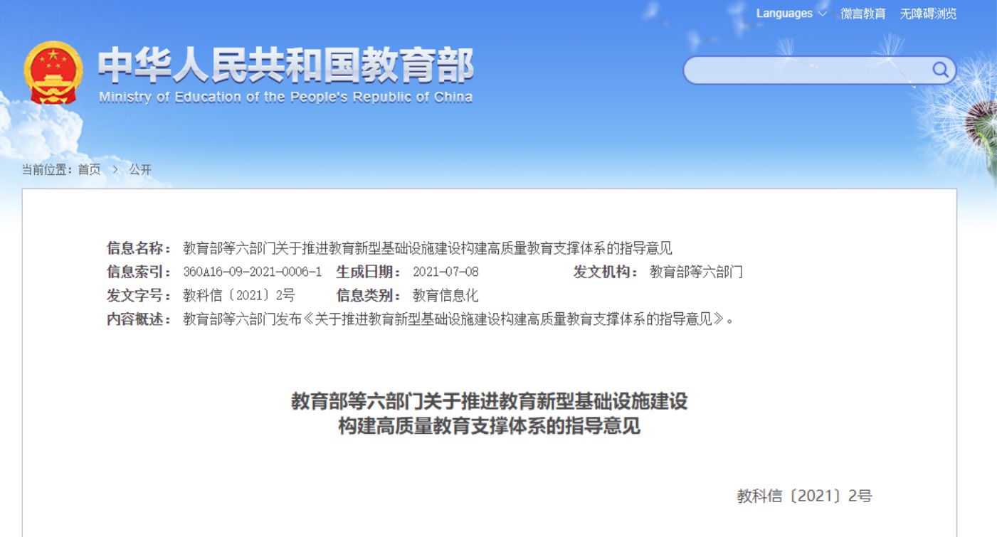 2021年7月21日,教育部等六部門(mén)印發(fā)《關(guān)于推進(jìn)教育新型基礎(chǔ)設(shè)施建設(shè)構(gòu)建高質(zhì)量教育支撐體系的指導(dǎo)意見(jiàn)》(以下簡(jiǎn)稱(chēng)《意見(jiàn)》),《意見(jiàn)》為教育新型基礎(chǔ)設(shè)施的發(fā)展方向提供指導(dǎo)。重視信息技術(shù)與教育教學(xué)的深度融合,基于“互聯(lián)網(wǎng)+教育”平臺(tái),探索新型教學(xué)方式,研發(fā)新的教學(xué)應(yīng)用,創(chuàng)新并落實(shí)新信息化評(píng)價(jià)工具,以提升教學(xué)質(zhì)量,促進(jìn)教育個(gè)性化。同時(shí),以智能技術(shù)為依托,助推教師隊(duì)伍建設(shè)與教育行政數(shù)字化轉(zhuǎn)型。