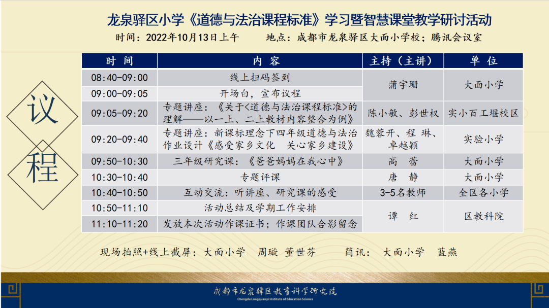 金秋十月,丹桂飄香,碩果滿枝。在這收獲的季節(jié),為了緊跟新課標(biāo)改革的步伐,全面提升道德與法治課堂教學(xué)水平,促進(jìn)教師專業(yè)化發(fā)展,10月13日,龍泉驛區(qū)各小學(xué)的道法教師通過“線上+線下”的方式參加了《道德與法治課程標(biāo)準(zhǔn)》學(xué)習(xí)暨智慧課堂教學(xué)研討活動(dòng)。