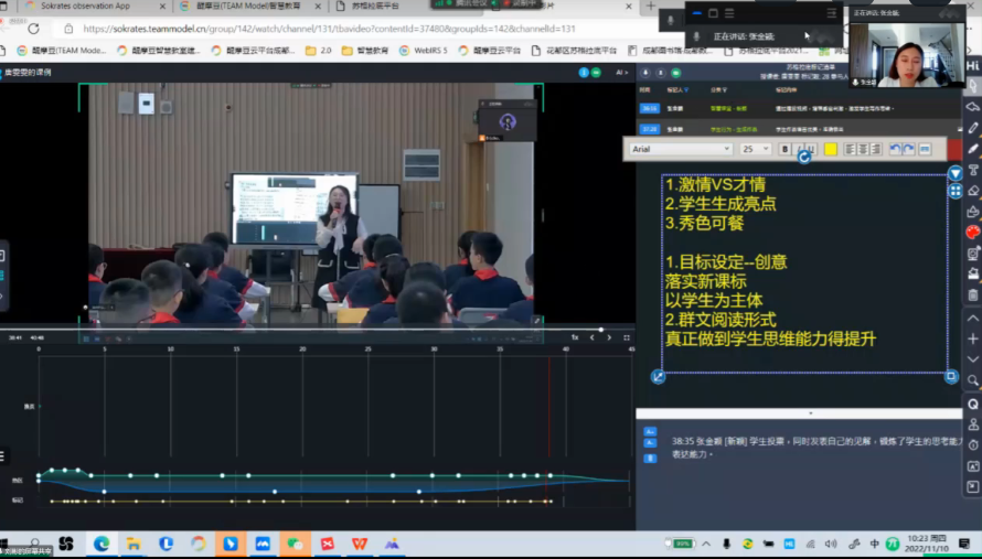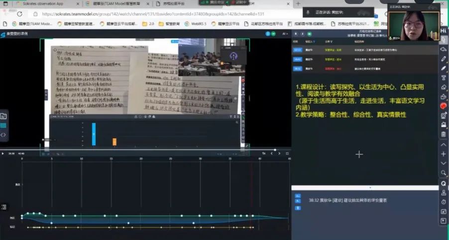 課例觀摩結(jié)束后,專家所標(biāo)記的打點清單立馬產(chǎn)出,蘇格拉底平臺也自動匯流所有議課數(shù)據(jù),主持人劉彬教授帶領(lǐng)大家進入線上教研環(huán)節(jié),平臺呈現(xiàn)了本節(jié)課例所產(chǎn)生的議課數(shù)據(jù),劉彬教授從波峰處提取熱點標(biāo)記,讓打點的專家進行一一闡述。