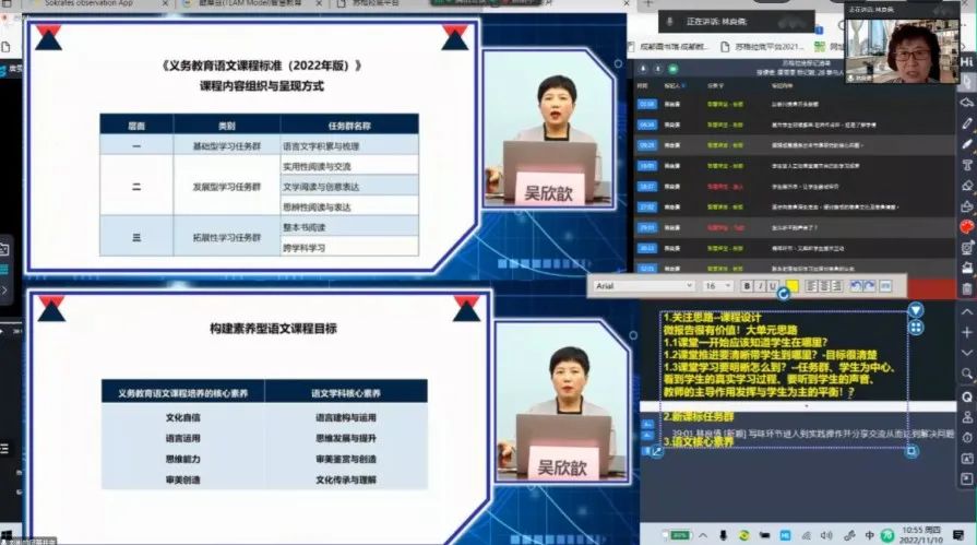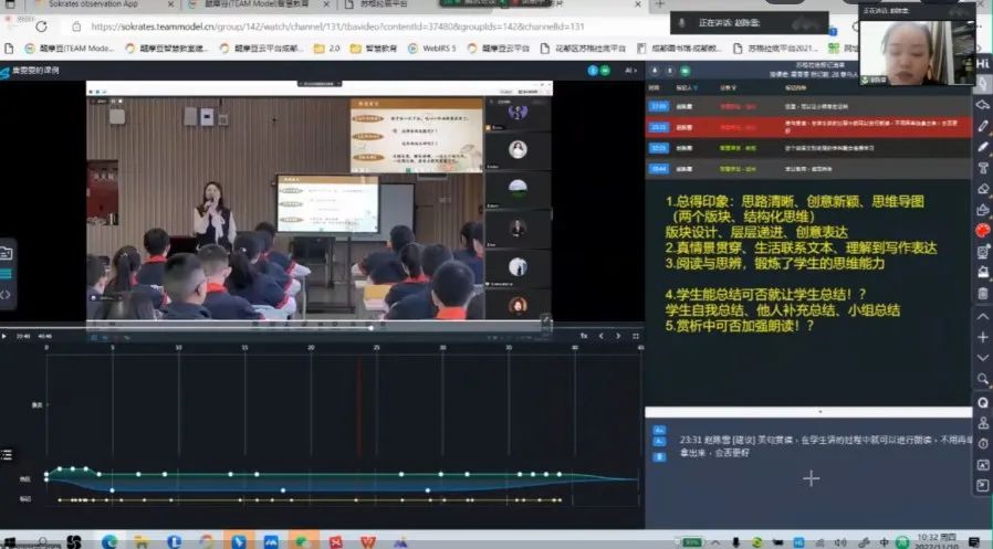 課例觀摩過程中,線上邀請的專家使用蘇格拉底議課APP進行同步評課議課,打點標(biāo)記,本次教研環(huán)節(jié)特邀珠海唐國安紀(jì)念學(xué)校特聘教師林良倩、四川師范大學(xué)附屬青臺山中學(xué)學(xué)科組長趙陳雪、廣州市花都區(qū)秀全外國語學(xué)校教師黃欣華、海倫市中澤學(xué)校班主任兼初中部語文教師張金穎參與研討活動。
