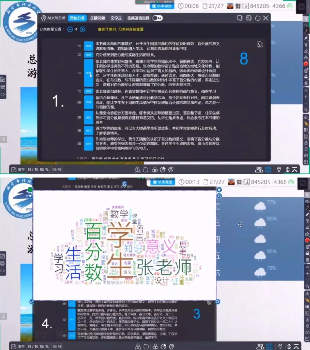 2022年11月20日,由《中國教育學(xué)刊》雜志社指導(dǎo),醍摩豆智慧教育研究院、醍摩豆AI智慧學(xué)校聯(lián)盟主辦,西寧市陽光小學(xué)承辦,陜西、青海、山西三省五市六所學(xué)校協(xié)同開展的“聚焦新課標(biāo) 精研智慧課”為主題的小學(xué)數(shù)學(xué)學(xué)科第六期教師教學(xué)交流分享活動成功舉辦,活動受到了全國各地4000多人同步觀摩。 此次活動參與線上教研的團隊有寶雞高新第三小學(xué)、楊凌高新小學(xué)、西安經(jīng)開第八小學(xué)、長治市潞州區(qū)淮海小學(xué)校、西安市浐灞實驗小學(xué)。同時,城西區(qū)黃河路小學(xué)、西寧市城西區(qū)文逸小學(xué)等學(xué)校也進行線上觀摩學(xué)習(xí)。 陽光小學(xué)張芳老師進行了六年級數(shù)學(xué)《認(rèn)識百分?jǐn)?shù)》的課堂教學(xué)展示。課堂緊密聯(lián)系生活實際,讓學(xué)生深刻地體會到了數(shù)學(xué)來源于生活,應(yīng)用于生活。整節(jié)課張老師時刻與學(xué)生互動,關(guān)注學(xué)生的掌握情況和學(xué)生知識的構(gòu)建。