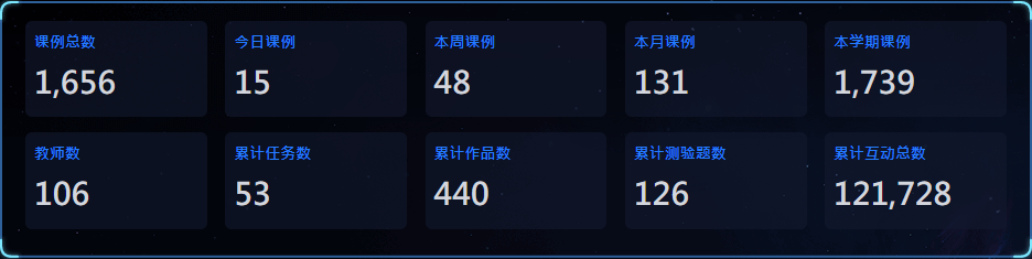 數(shù)據(jù)總覽:自動統(tǒng)計顯示課例總數(shù),從整體上呈現(xiàn)學(xué)校智慧課堂使用情況;從單日、本周、本月、本學(xué)期進行細分,在不同時間段呈現(xiàn)學(xué)校智慧課堂使用情況;為加速學(xué)校智慧課堂推進提供可靠依據(jù)。